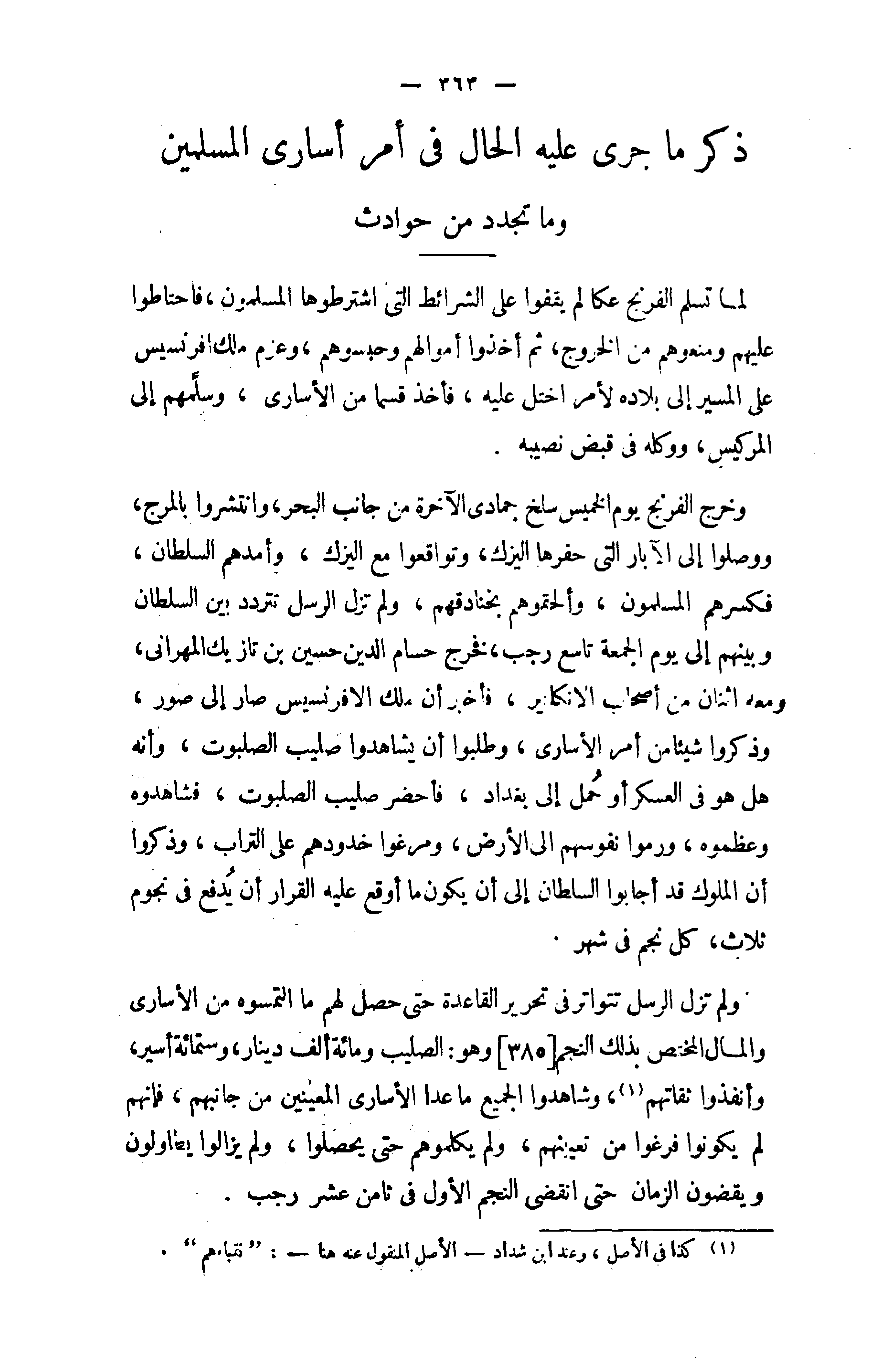 ولم تزل الرسل تتواتر في تحرير القاعدة حتى حصل لهم ما التمسوه من الأسارى والمال المختص بذلك النجم [385] وهو: الصليب ومائة ألف دينار، وستمائة أسير، وأنفذوا ثقاتهم (¬1)، وشاهدوا الجميع ماعدا الأسارى المعينين من جانبهم، فإنهم لم يكونوا فرغوا من تعيينهم، ولم يكلموهم حتى يحصلوا، ولم يزالوا يطاولون ويقضون الزمان حتى انقضى النجم الأول في ثامن عشر رجب.
