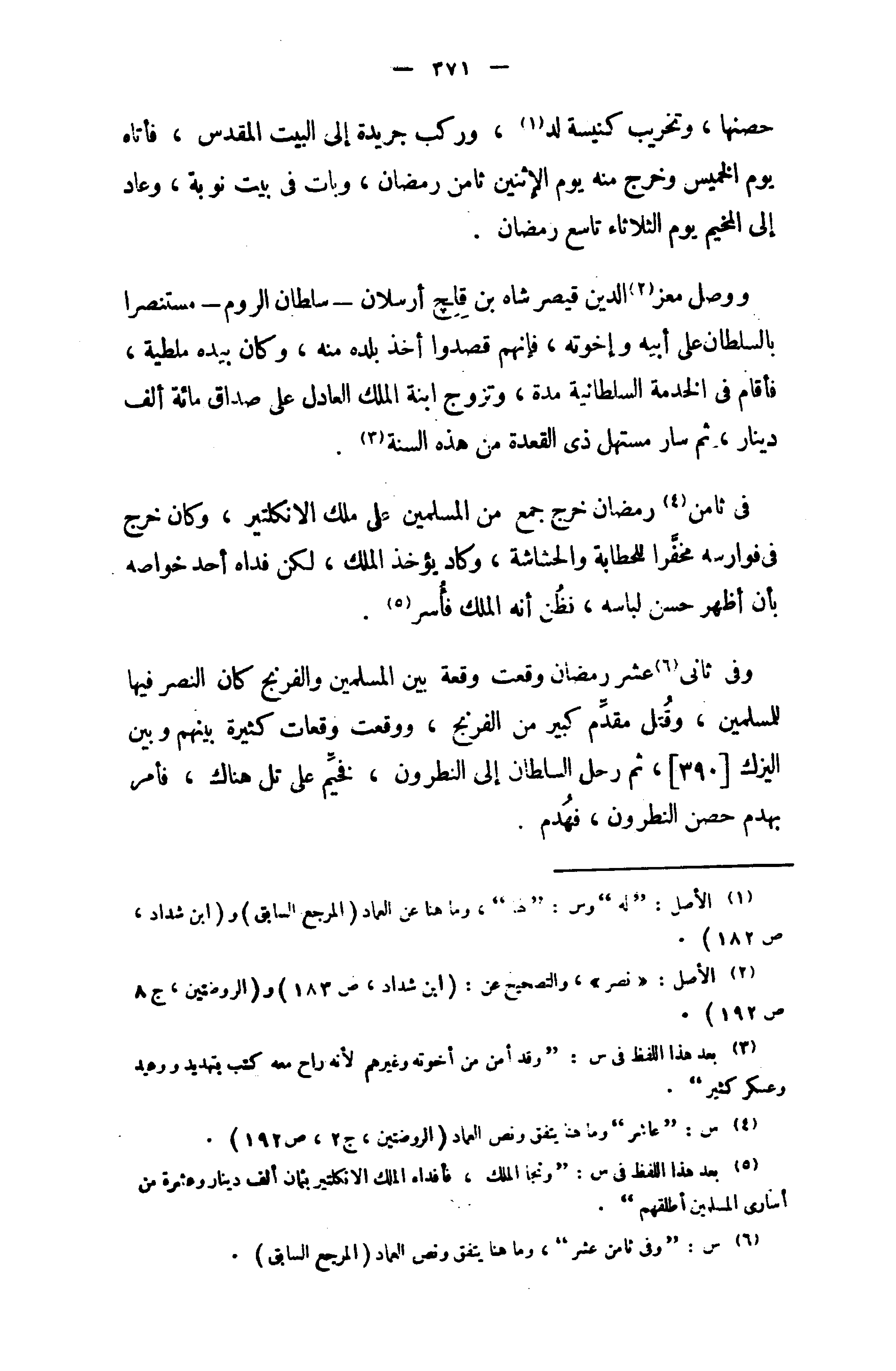 حصنها، وتخريب كنيسة لد (¬1)، وركب جريدة إلى البيت المقدس، فأتاه يوم الخميس وخرج منه يوم الإثنين ثامن رمضان، وبات في بيت نوبة، وعاد إلى المخيم يوم الثلاثاء تاسع رمضان.