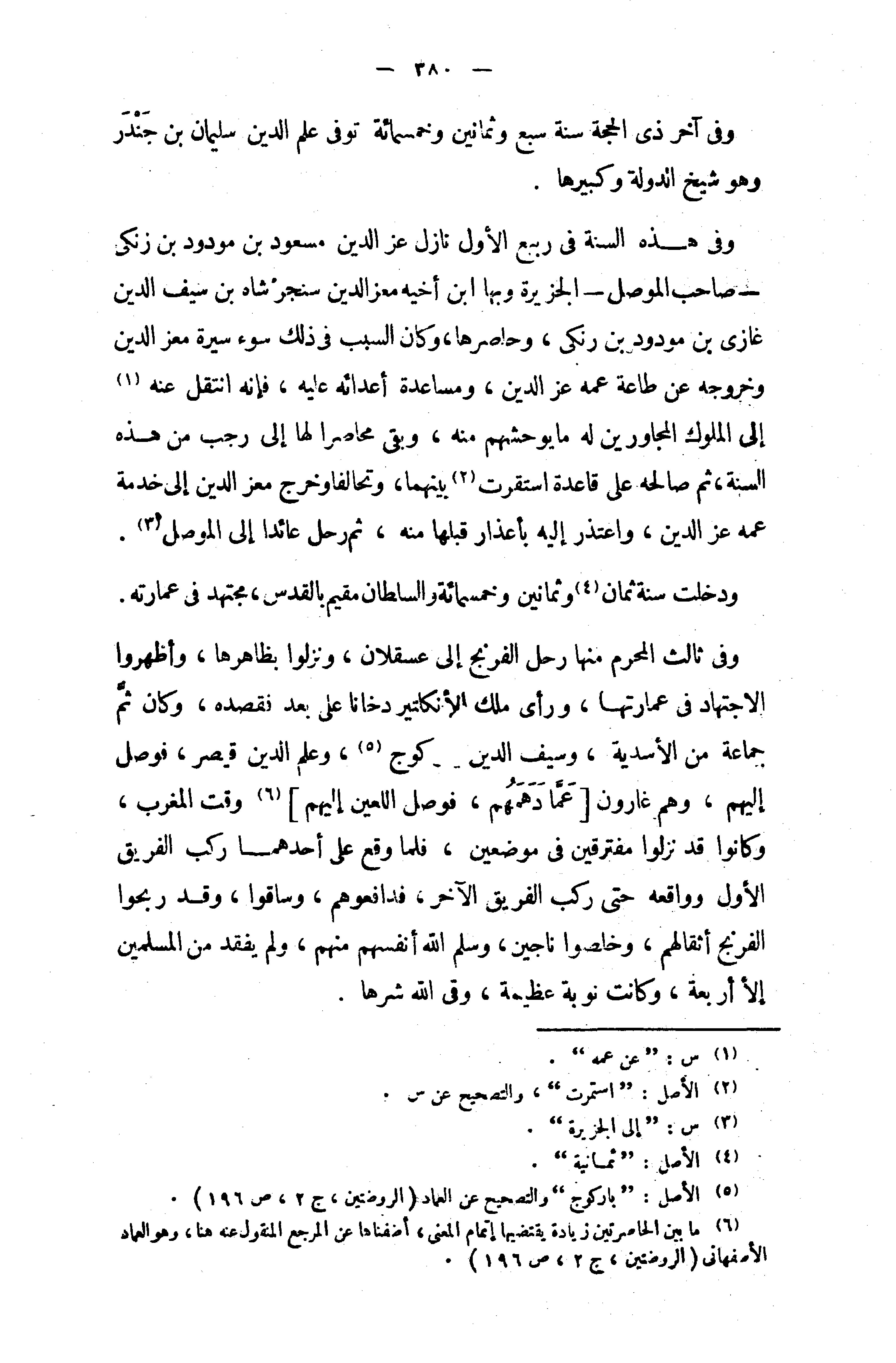 (¬6) ما بين الحاصرتين زيادة يقتضيها إتمام المعنى، أضفناها عن المرجع المنقول عنه هنا، وهو العماد الأصفهانى (الروضتين، ج 2، ص 196).