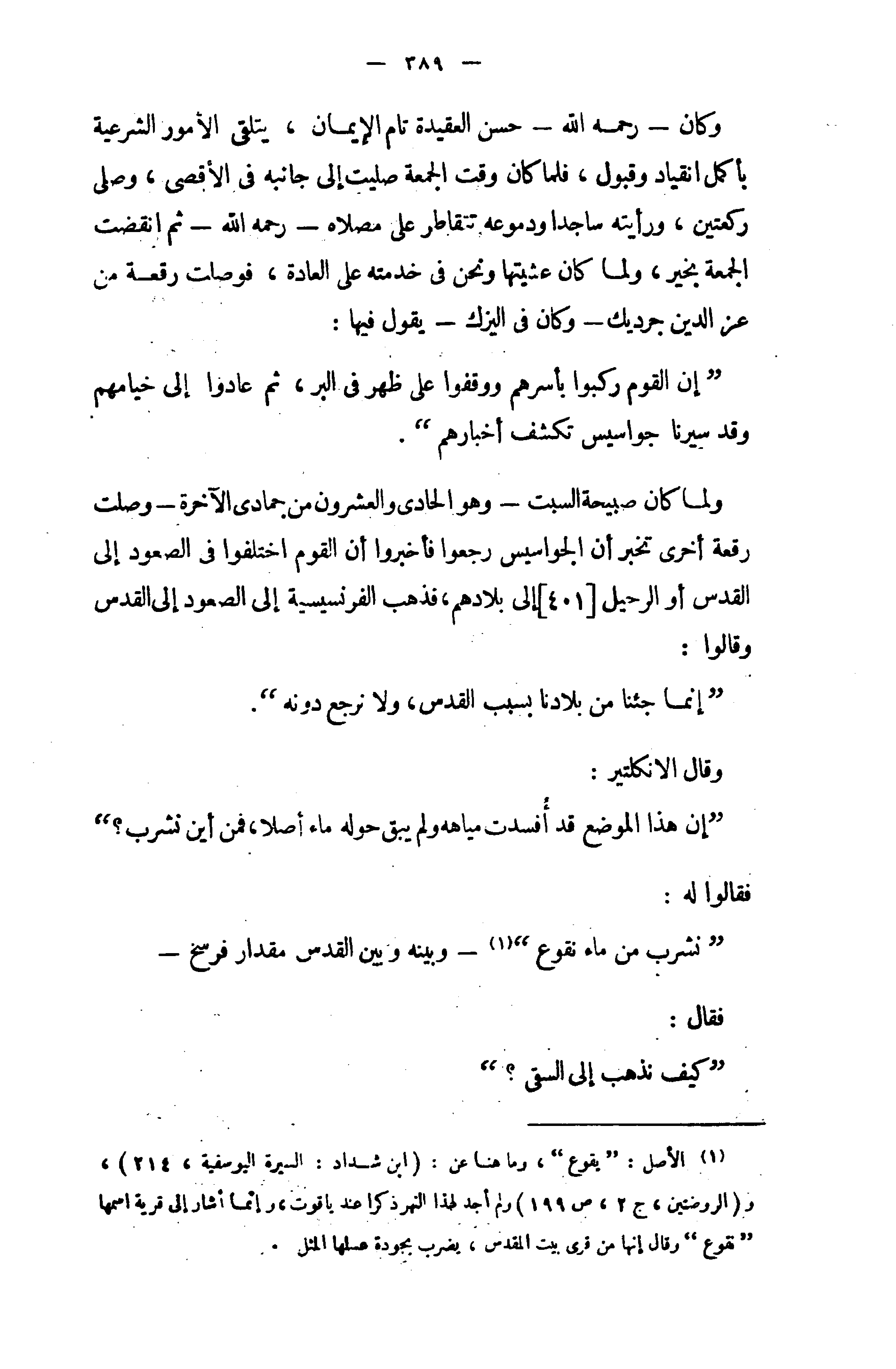 ولما كان صبيحة السبت - وهو الحادى والعشرون من جمادى الآخرة - وصلت رقعة أخرى تخبر أن الجواسيس رجعوا فأخبروا أن القوم اختلفوا في الصعود إلى القدس أو الرحيل [401] إلى بلادهم، فذهب الفرنسيسية إلى الصعود إلى القدس وقالوا: