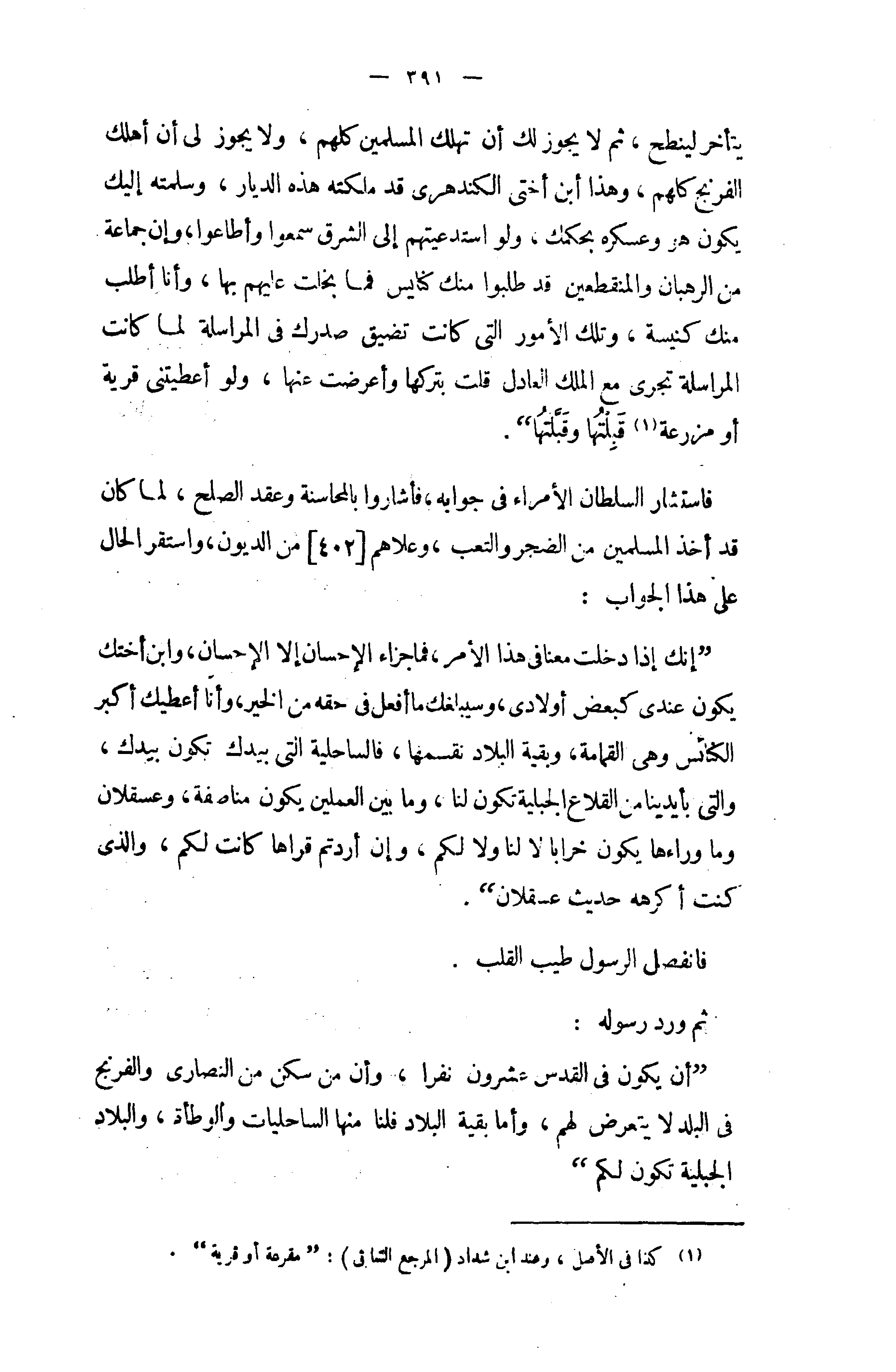 " أن يكون في القدس عشرون نفرا، وأن من سكن من النصارى والفرنج في البلد لا يتعرض لهم، وأما بقية البلاد فلنا منها الساحليات والوطأة، والبلاد الجبلية تكون لكم "