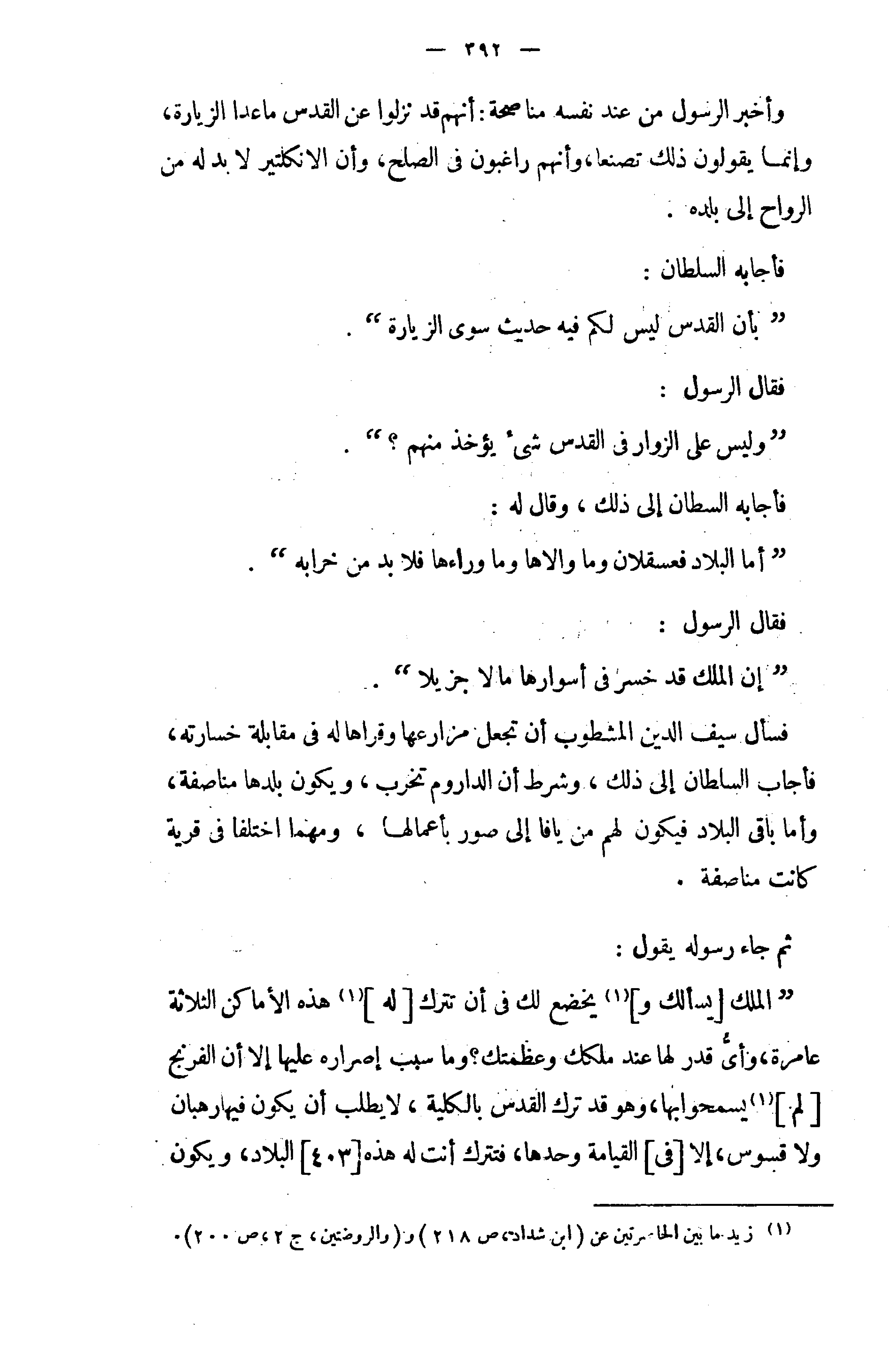 " الملك [يسألك و] (1) يخضع لك في أن تترك [له] (1) هذه الأماكن الثلاثة عامرة، وأىّ قدر لها عند ملكك وعظمتك؟ وما سبب إصراره عليها إلا أن الفرنج [لم] (¬1) يسمحوا بها، وهو قد ترك القدس بالكلية، لا يطلب أن يكون فيها رهبان ولا قسوس، إلا [في] القيامة وحدها، فتترك أنت له هذه [403] البلاد، ويكون