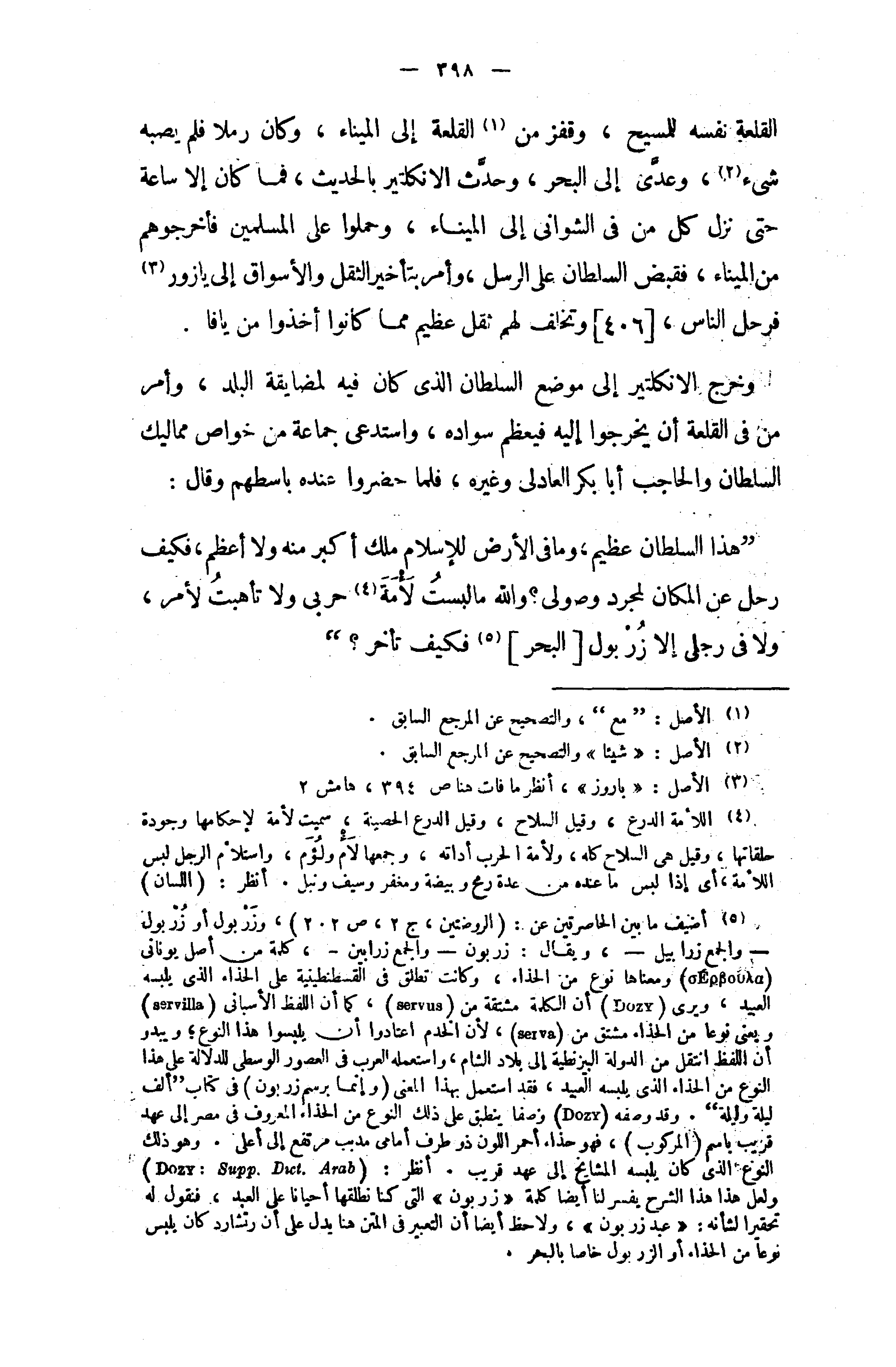 (¬5) أضيف ما بين الحاصرتين عن: (الروضتين، ج 2، ص 202)، وزربول أو زربول - والجمع زرابيل -، ويقال: زربون - والجمع زرابين -، كلمة من أصل يونانى ومعناها نوع من الحذاء، وكانت تطلق في القسطنطينية على الحذاء الذى يلبسه العبيد، ويرى (DOZY) أن الكلمة مشتقة من، (servus) كما أن اللفظ الأسبانى (servilla) ويعنى نوعا من الحذاء مشتق من، (serva) لأن الخدم اعتادوا أن يلبسوا هذا النوع؛ ويبدو أن اللفظ انتقل من الدولة البيزنطية إلى بلاد الشام، واستعمله العرب في العصور الوسطى للدلالة على هذا النوع من الحذاء الذى يلبسه العبيد، فقد استعمل بهذا المعنى (وإنما برسم زربون) في كتاب " ألف ليلة وليلة ". وقد وصفه (DOZY) وصفا ينطبق على ذلك النوع من الحذاء المعروف في مصر إلى عهد قريب باسم (المركوب)، فهو حذاء أحمر اللون ذو طرف أمامى مدبب مرتفع إلى أعلى. وهو ذلك النوع الذى كان يلبسه المشايخ إلى عهد قريب. أنظر: (DOZY : Supp .Dict .Arab) ولعل هذا هذا الشرح يفسر لنا أيضا كلمة «زربون» التي كنا نطلقها أحيانا على العبد، فنقول له تحقيرا لشأنه: «عبد زربون»، ولاحظ أيضا أن التعبير في المتن هنا يدل على أن رتشارد كان يلبس نوعا من الحذاء أو الزربول خاصا بالبحر.