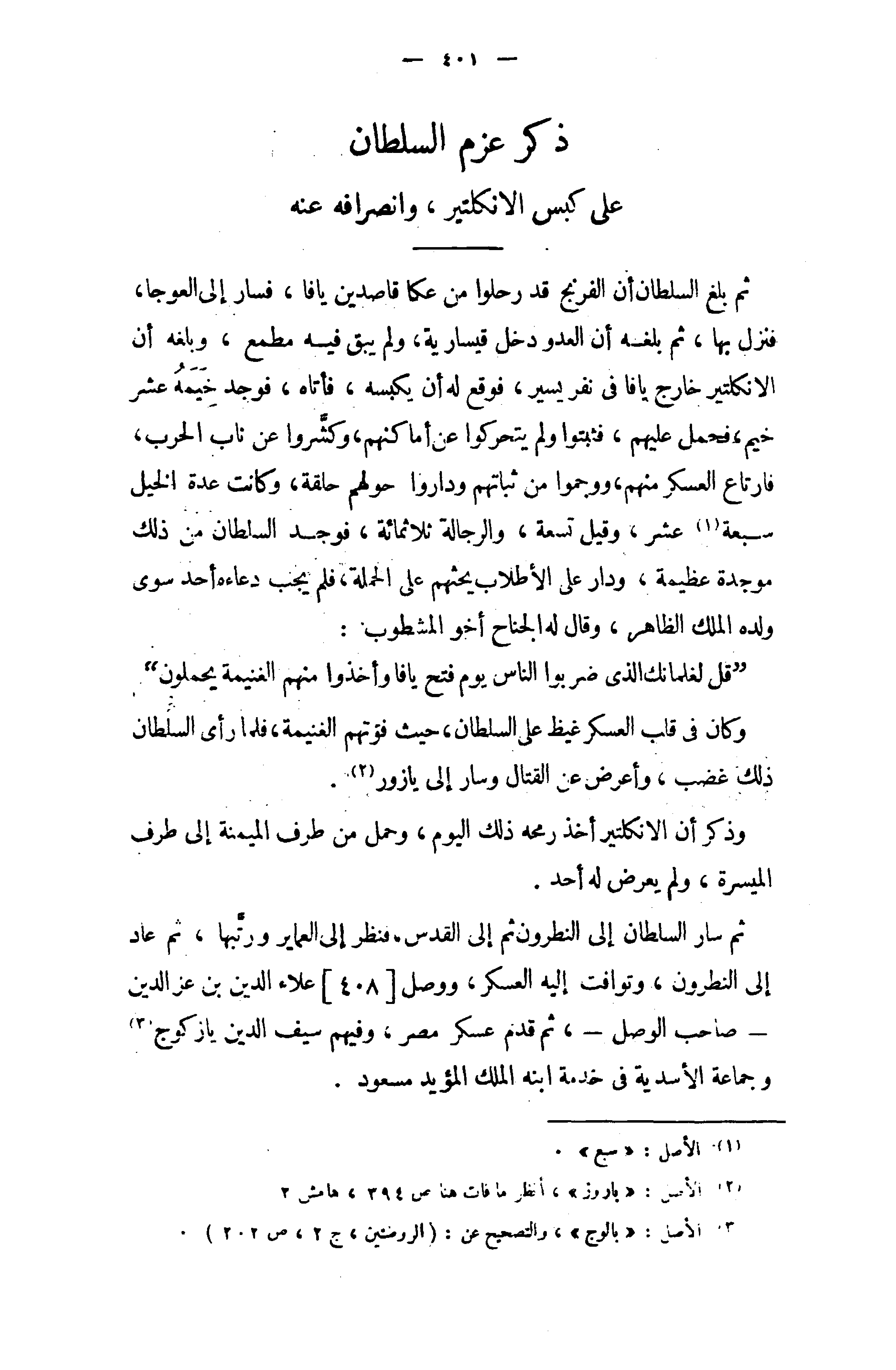 ثم سار السلطان إلى النطرون ثم إلى القدس، فنظر إلى العماير ورتّبها، ثم عاد إلى النطرون، وتوافت إليه العسكر، ووصل [408] علاء الدين بن عز الدين - صاحب الوصل -، ثم قدم عسكر مصر، وفيهم سيف الدين يازكوج (¬3) وجماعة الأسدية في خدمة ابنه الملك المؤيد مسعود.