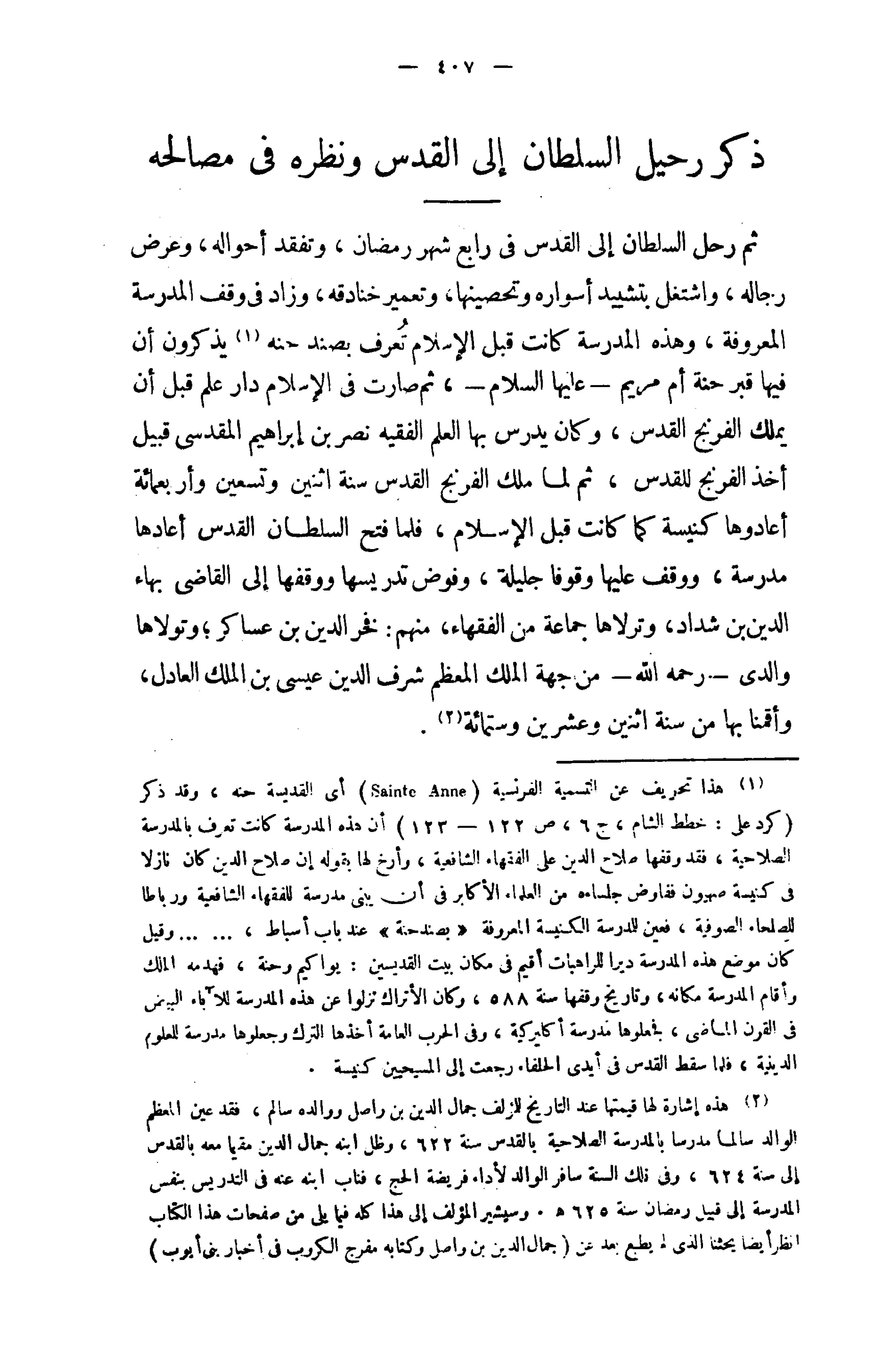 ثم رحل السلطان إلى القدس في رابع شهر رمضان، وتفقد أحواله، وعرض رجاله، واشتغل بتشييد أسواره وتحصينها، وتعمير خنادقه، وزاد في وقف المدرسة المعروفة، وهذه المدرسة كانت قبل الإسلام تعرف بصند حنه (¬1) يذكرون أن فيها قبر حنة أم مريم - عليها السلام -، ثم صارت في الإسلام دار علم قبل أن يملك الفرنج القدس، وكان يدرس بها العلم الفقيه نصر بن إبراهيم المقدسى قبيل أخذ الفرنج للقدس، ثم لما ملك الفرنج القدس سنة اثنين وتسعين وأربعمائة أعادوها كنيسة كما كانت قبل الإسلام، فلما فتح السلطان القدس أعادها مدرسة، ووقف عليها وقوفا جليلة، وفوض تدريسها ووقفها إلى القاضى بهاء الدين بن شداد، وترلاها جماعة من الفقهاء، منهم: فخر الدين بن عساكر؛ وتولاها والدى - رحمه الله - من جهة الملك المعظم شرف الدين عيسى بن الملك العادل، وأقمنا بها من سنة اثنين وعشرين وستمائة (¬2).