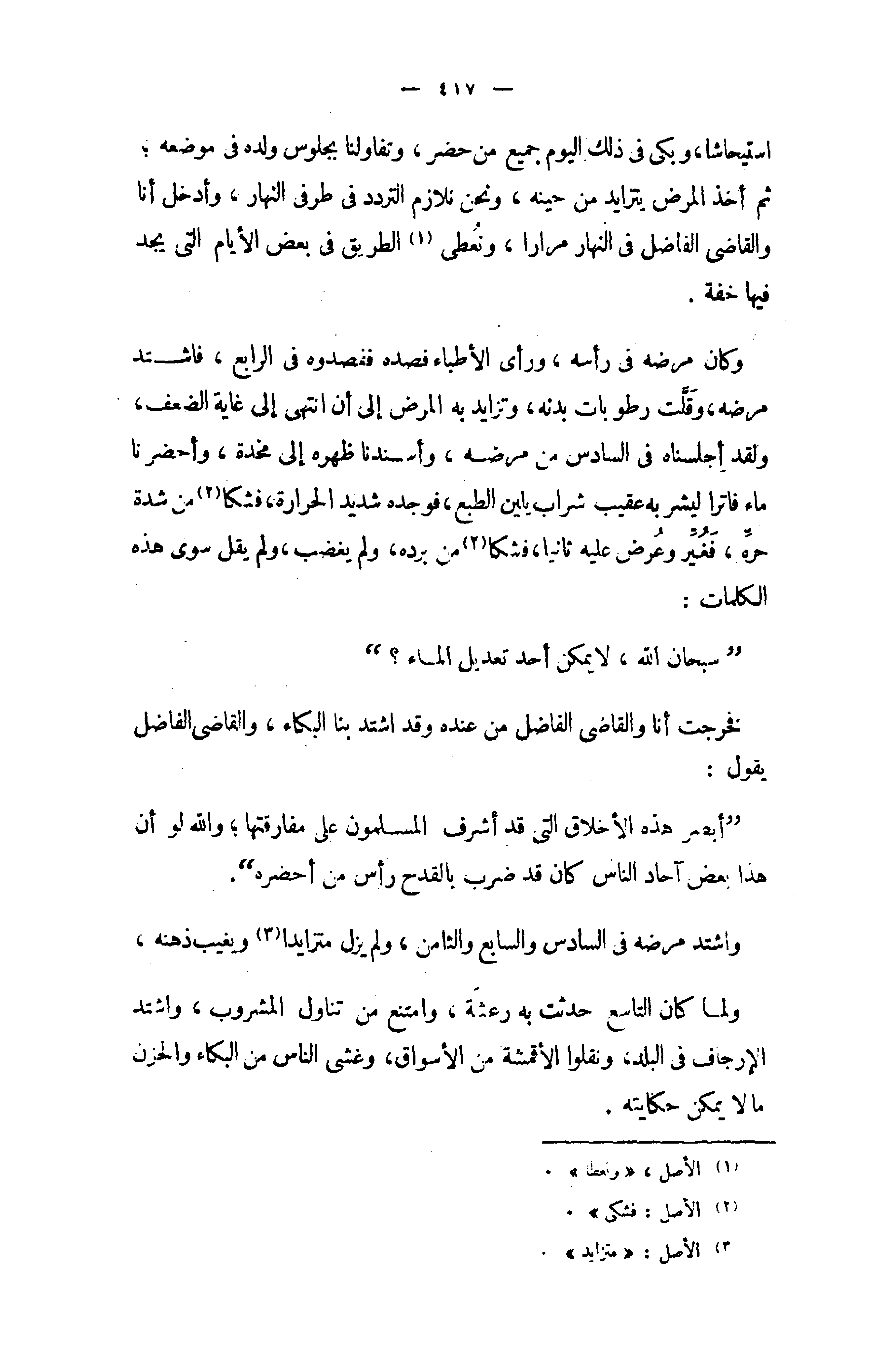 وكان مرضه في رأسه، ورأى الأطباء فصده ففصدوه في الرابع، فاشتد مرضه، وقلّت رطوبات بدنه، وتزايد به المرض إلى أن انتهى إلى غاية الضعف، ولقد أجلسناه في السادس من مرضه، وأسندنا ظهره إلى مخدة، وأحضرنا ماء فاترا ليشر به عقيب شراب يلين الطبع، فوجده شديد الحرارة، فشكا (¬2) من شدة حرّه، فغيّر وعرض عليه ثانيا، فشكا (2) من برده، ولم يغضب، ولم يقل سوى هذه الكلمات: