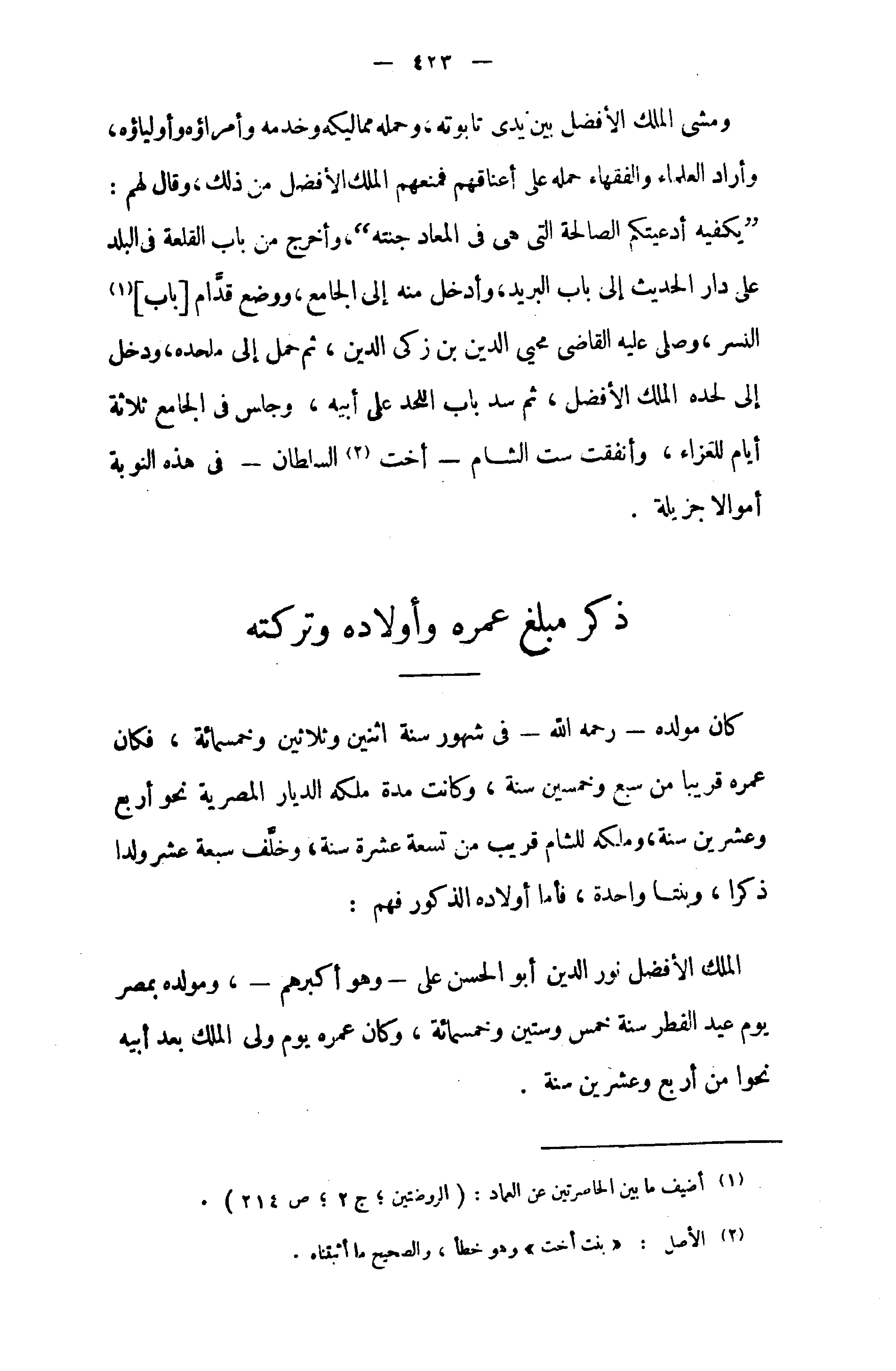 " يكفيه أدعيتكم الصالحة التي هى في المعاد جنته "، وأخرج من باب القلعة في البلد على دار الحديث إلى باب البريد، وأدخل منه إلى الجامع، ووضع قدّام [باب] (¬1) النسر، وصلى عليه القاضى محيى الدين بن زكى الدين، ثم حمل إلى ملحده، ودخل إلى لحده الملك الأفضل، ثم سد باب اللحد على أبيه، وجلس في الجامع ثلاثة أيام للعزاء، وأنفقت ست الشام - أخت (¬2) السلطان - في هذه النوبة أموالا جزيلة.