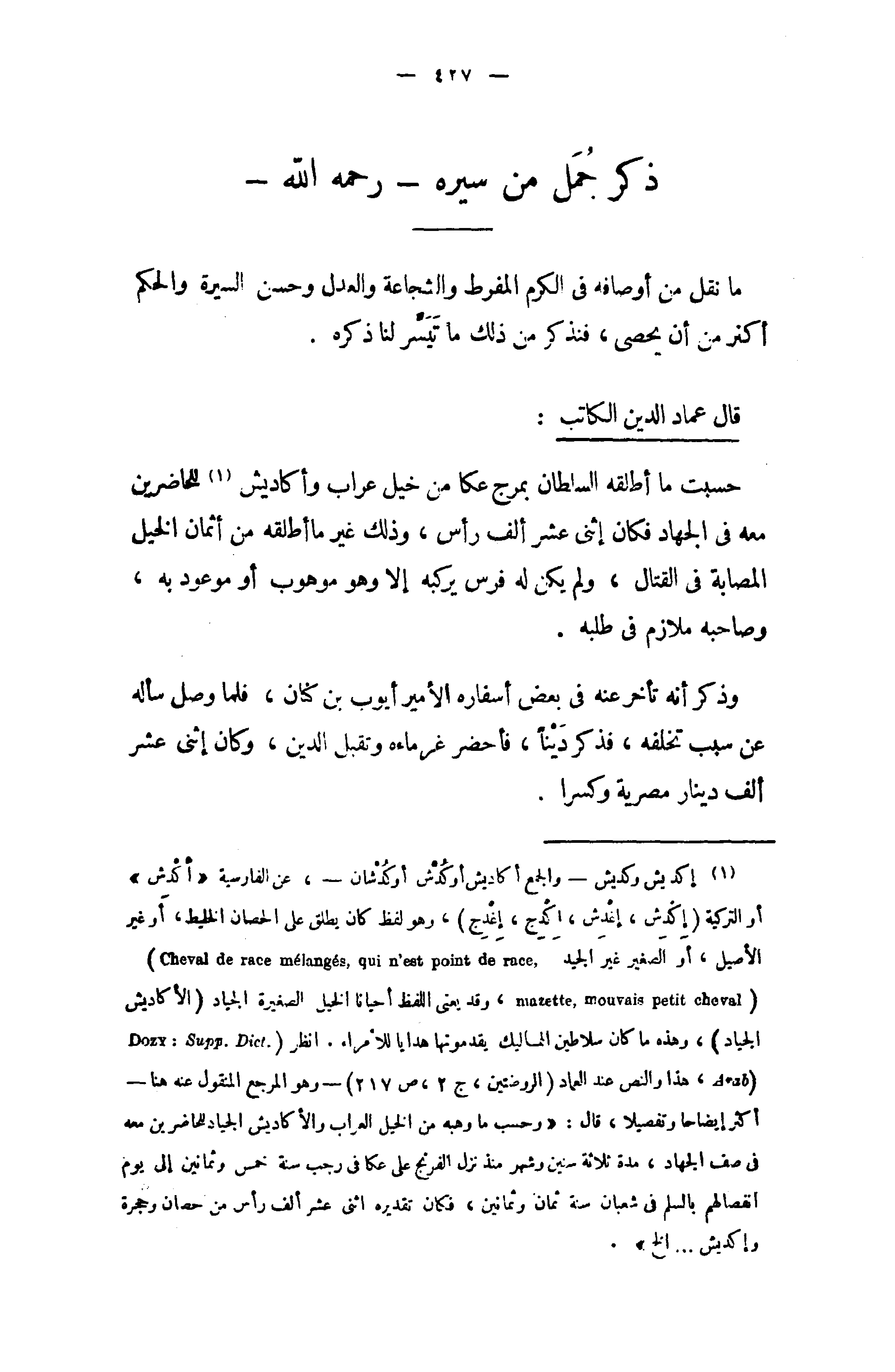 (¬1) إكديش وكديش - والجمع أكاديش أو كدش أو كدشان -، عن الفارسية «أكدش» أو التركية (إكدش، إغدش، اكدج، إغدج)، وهو لفظ كان يطلق على الحصان الخليط، أو غير الأصيل، أو الصغير غير الجيد (Cheval de race melanges,qui n'est point de race mazette,mouvais petit cheval) ، وقد يعنى اللفظ أحيانا الخيل الصغيرة الجياد (الأكاديش الجياد)، وهذه ما كان سلاطين المماليك يقدمونها هدايا للأمراء. انظر (DOZY : Supp. Dict. Arab) ، هذا والنص عند العماد (الروضتين، ج 2، ص 217) - وهو المرجع المنقول عنه هنا - أكثر إيضاحا وتفصيلا، قال: «وحسب ما وهبه من الخيل العراب والأكاديش الجياد للحاضرين معه في صف الجهاد، مدة ثلاثة سنين وشهر منذ نزل الفرنج على عكا في رجب سنة خمس وثمانين إلى يوم انفصالهم بالسلم في شعبان سنة ثمان وثمانين، فكان تقديره اثنى عشر ألف رأس من حصان وحجرة وإكديش. . . الخ».