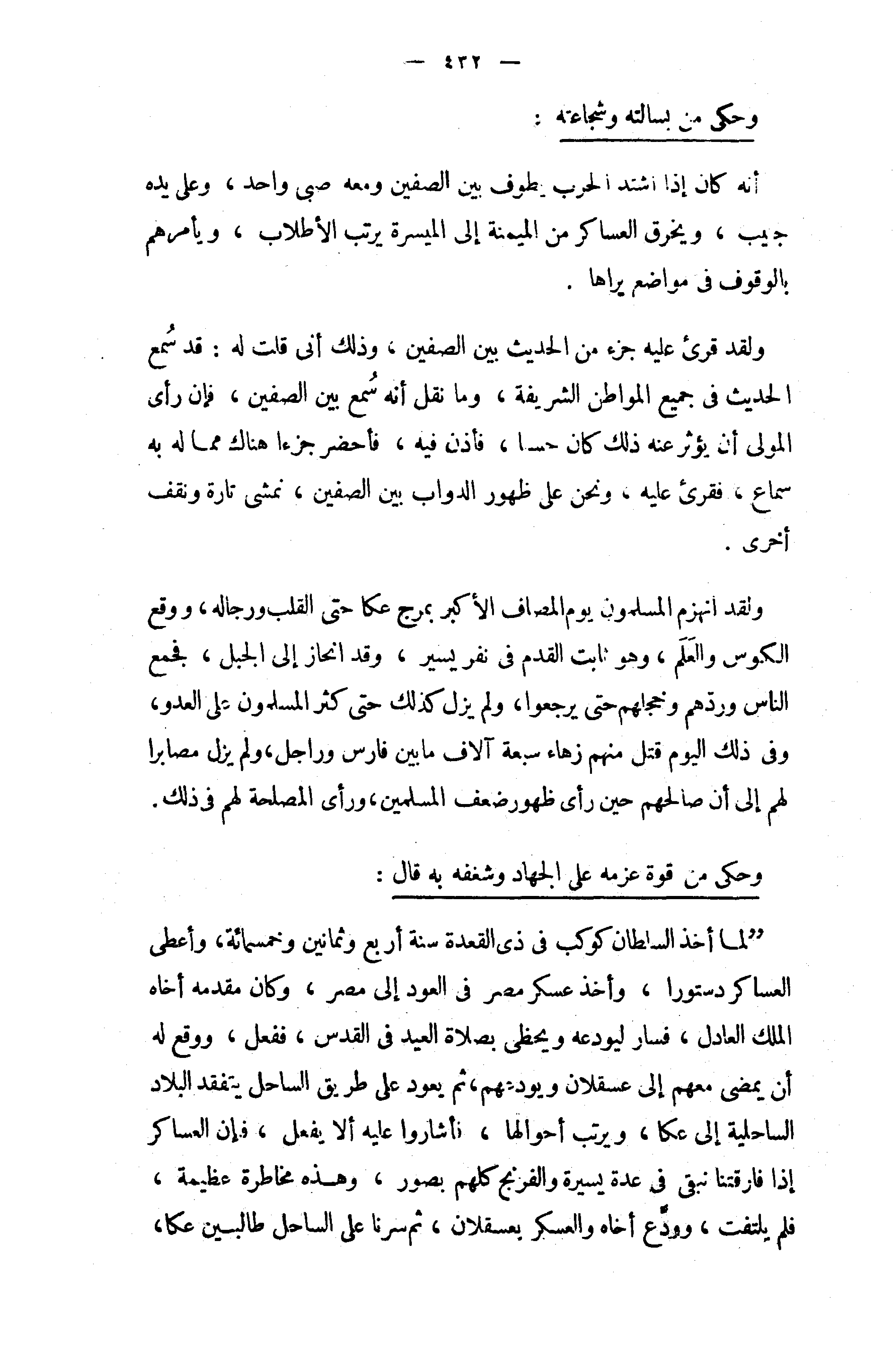 ولقد قرئ عليه جزء من الحديث بين الصفين، وذلك أنى قلت له: قد سمع الحديث في جميع المواطن الشريفة، وما نقل أنه سمع بين الصفين، فإن رأى المولى أن يؤثر عنه ذلك كان حسا، فأذن فيه، فأحضر جزءا هناك مما له به سماع، فقرئ عليه، ونحن على ظهور الدواب بين الصفين، نمشى تارة ونقف أخرى.