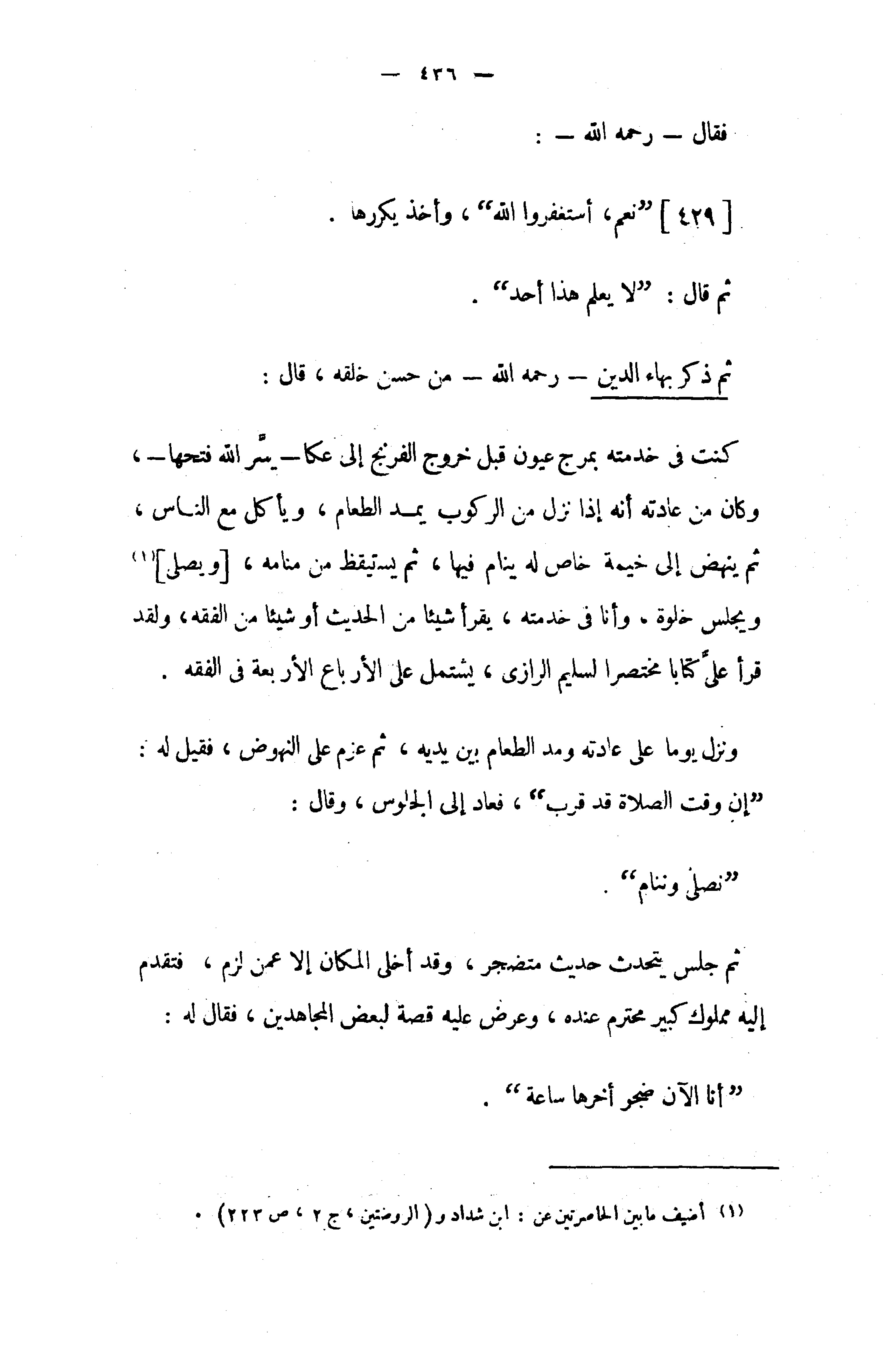 ثم ذكر بهاء الدين - رحمه الله - من حسن خلقه، قال: