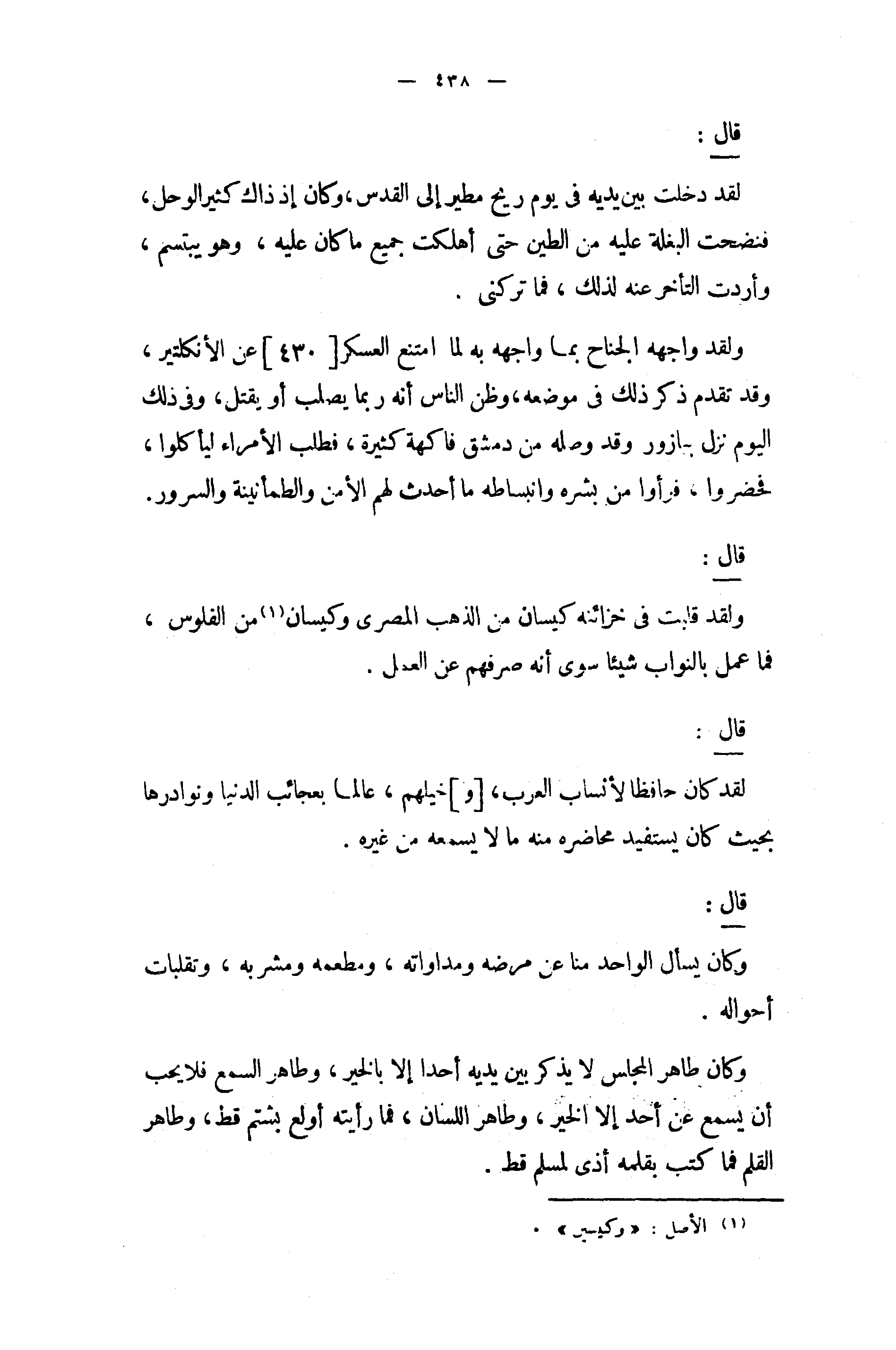 وكان طاهر المجلس لا يذكر بين يديه أحدا إلا بالخير، وطاهر السمع فلا يحب أن يسمع عن أحد إلا الخير، وطاهر اللسان، فما رأيته أولع بشتم قط، وطاهر القلم فما كتب بقلمه أذى لمسلم قط.