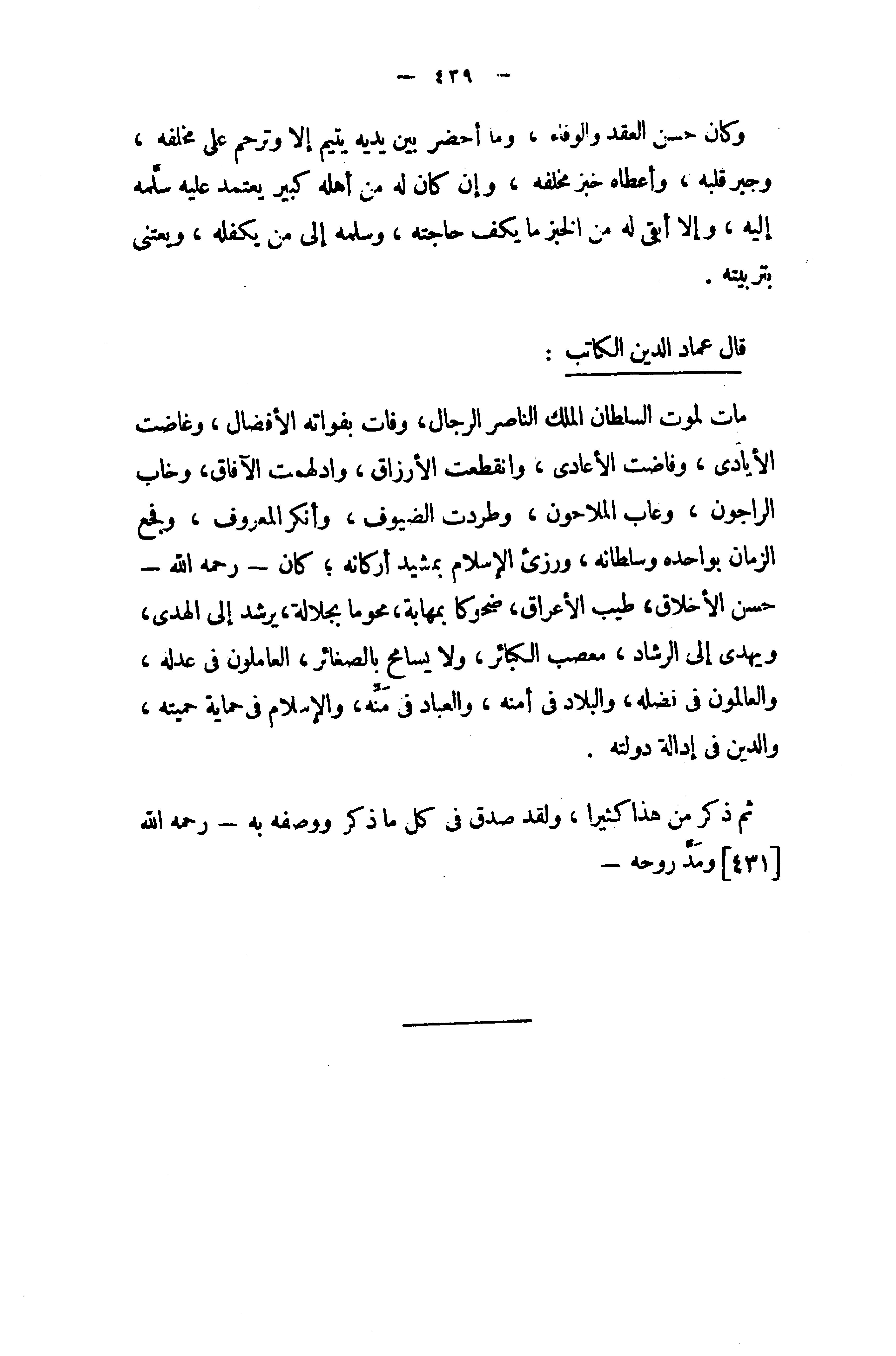 مات لموت السلطان الملك الناصر الرجال، وفات بفواته الأفضال، وغاضت الأيادى، وفاضت الأعادى، وانقطعت الأرزاق، وادلهمت الآفاق، وخاب الراجون، وعاب الملاحون، وطردت الضيوف، وأنكر المعروف، وفجع الزمان بواحده وسلطانه، ورزئ الإسلام بمشيد أركانه؛ كان - رحمه الله - حسن الأخلاق، طيب الأعراق، ضحوكا بمهابة، محوما بجلالة، يرشد إلى الهدى، ويهدى إلى الرشاد، معصب الكبائر، ولا يسامح بالصغائر، العاملون في عدله، والعالمون في فضله، والبلاد في أمنه، والعباد في منّه، والإسلام في حماية حميته، والدين في إدالة دولته.