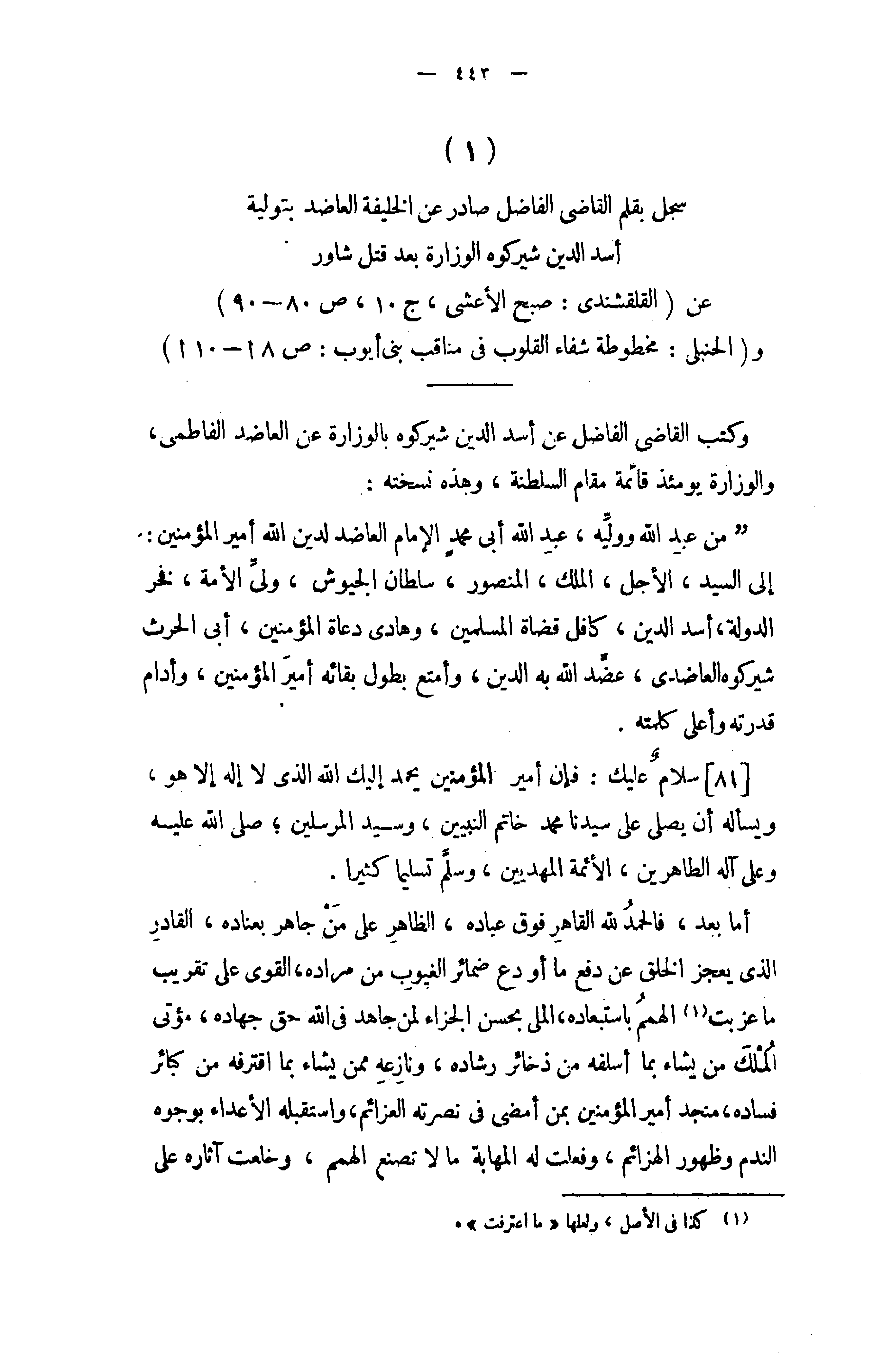 عن (القلقشندى: صبح الأعشى، ج 10، ص 80 - 90) و (الحنبلى: مخطوطة شفاء القلوب في مناقب بنى أيوب: ص 8 أ - 10 أ) وكتب القاضى الفاضل عن أسد الدين شيركوه بالوزارة عن العاضد الفاطمى، والوزارة يومئذ قائمة مقام السلطنة، وهذه نسخته: