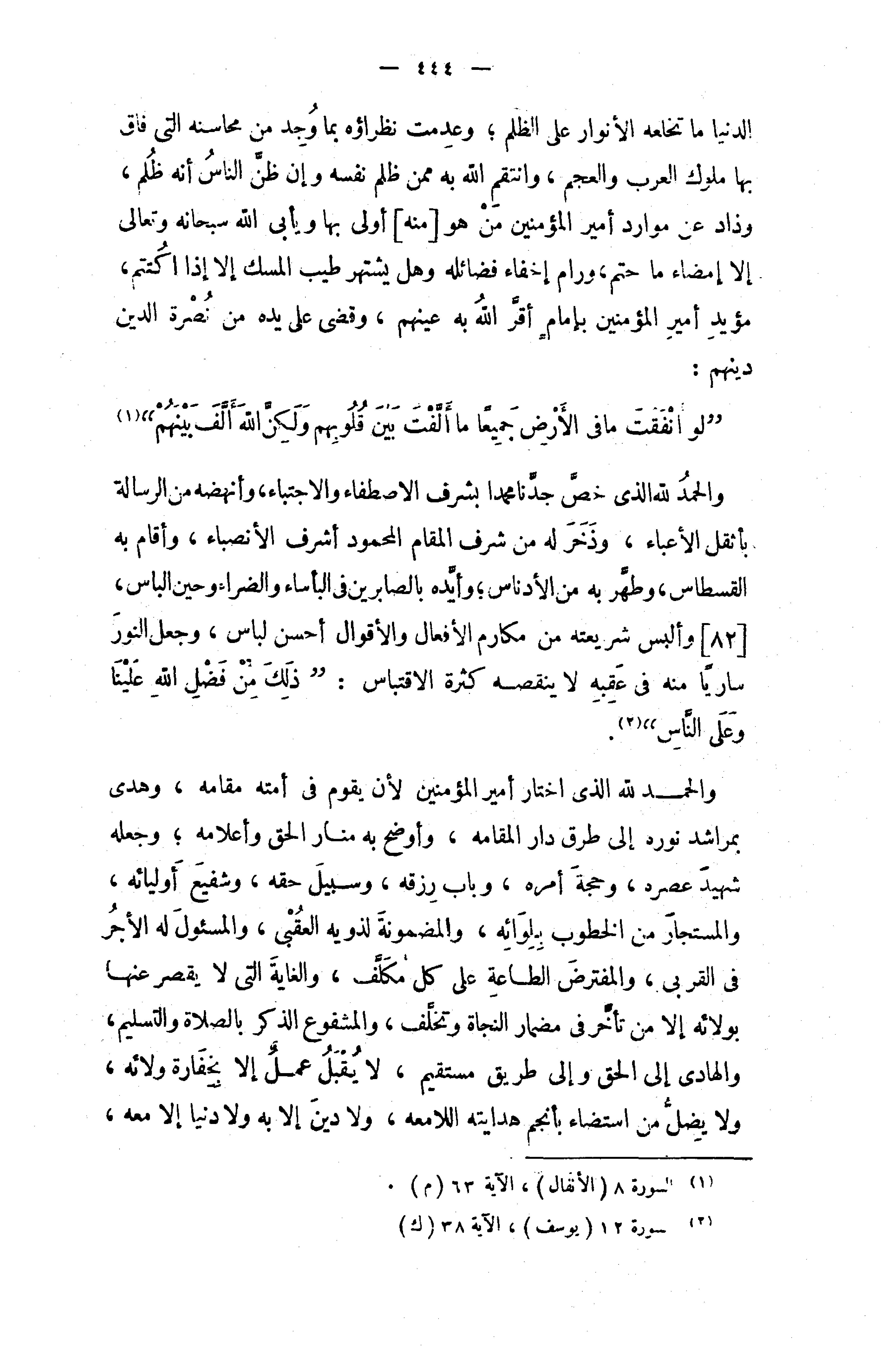 والحمد لله الذى اختار أمير المؤمنين لأن يقوم في أمته مقامه، وهدى بمراشد نوره إلى طرق دار المقامه، وأوضح به منار الحق وأعلامه؛ وجعله شهيد عصره، وحجة أمره، وباب رزقه، وسبيل حقه، وشفيع أوليائه، والمستجار من الخطوب بلوائه، والمضمونة لذويه العقبى، والمسئول له الأجر في القربى، والمفترض الطاعة على كل مكلّف، والغاية التي لا يقصر عنها بولائه إلا من تأخّر في مضمار النجاة وتخلّف، والمشفوع الذكر بالصلاة والتسليم، والهادى إلى الحق وإلى طريق مستقيم، لا يقبل عمل إلا بخفارة ولائه، ولا يضلّ من استضاء بأنجم هدايته اللامعه، ولا دين إلا به ولا دنيا إلا معه،
