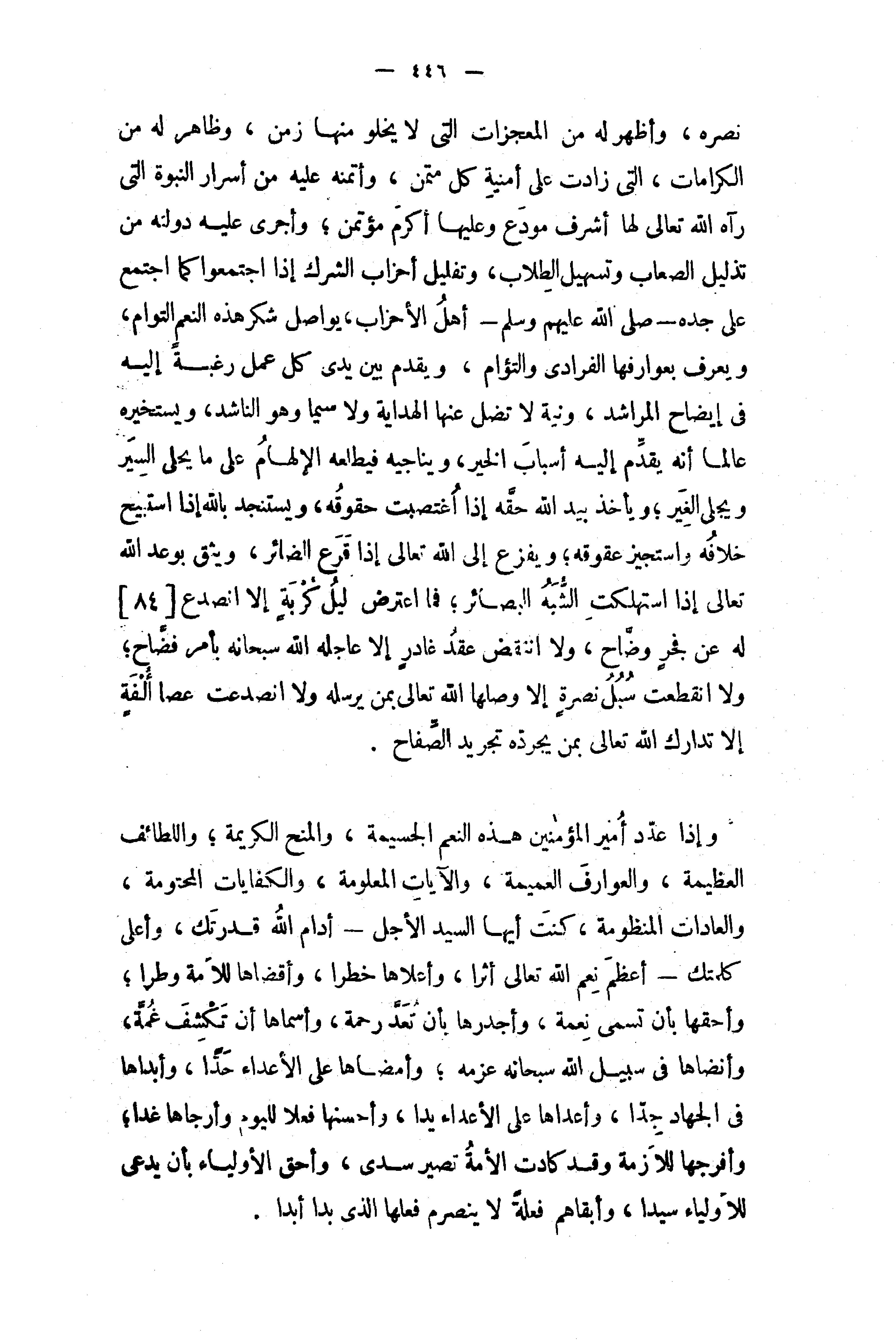وإذا عدّد أمير المؤمنين هذه النعم الجسيمة، والمنح الكريمة؛ واللطائف العظيمة، والعوارف العميمة، والآيات المعلومة، والكفايات المحتومة، والعادات المنظومة، كنت أيها السيد الأجل - أدام الله قدرتك، وأعلى كلمتك - أعظم نعم الله تعالى أثرا، وأعلاها خطرا، وأقضاها للامة وطرا؛ وأحقها بأن تسمى نعمة، وأجدرها بأن تعدّ رحمة، وأسماها أن تكشف غمّة، وأنضاها في سبيل الله سبحانه عزمه؛ وأمضاها على الأعداء حدّا، وأبداها في الجهاد جدّا، وأعداها على الأعداء يدا، وأحسنها فعلا لليوم وأرجاها غدا؛ وأفرجها للازمة وقد كادت الأمة تصير سدى، وأحق الأولياء بأن يدعى للأولياء سيدا، وأبقاهم فعلة لا ينصرم فعلها الذى بدا أبدا.