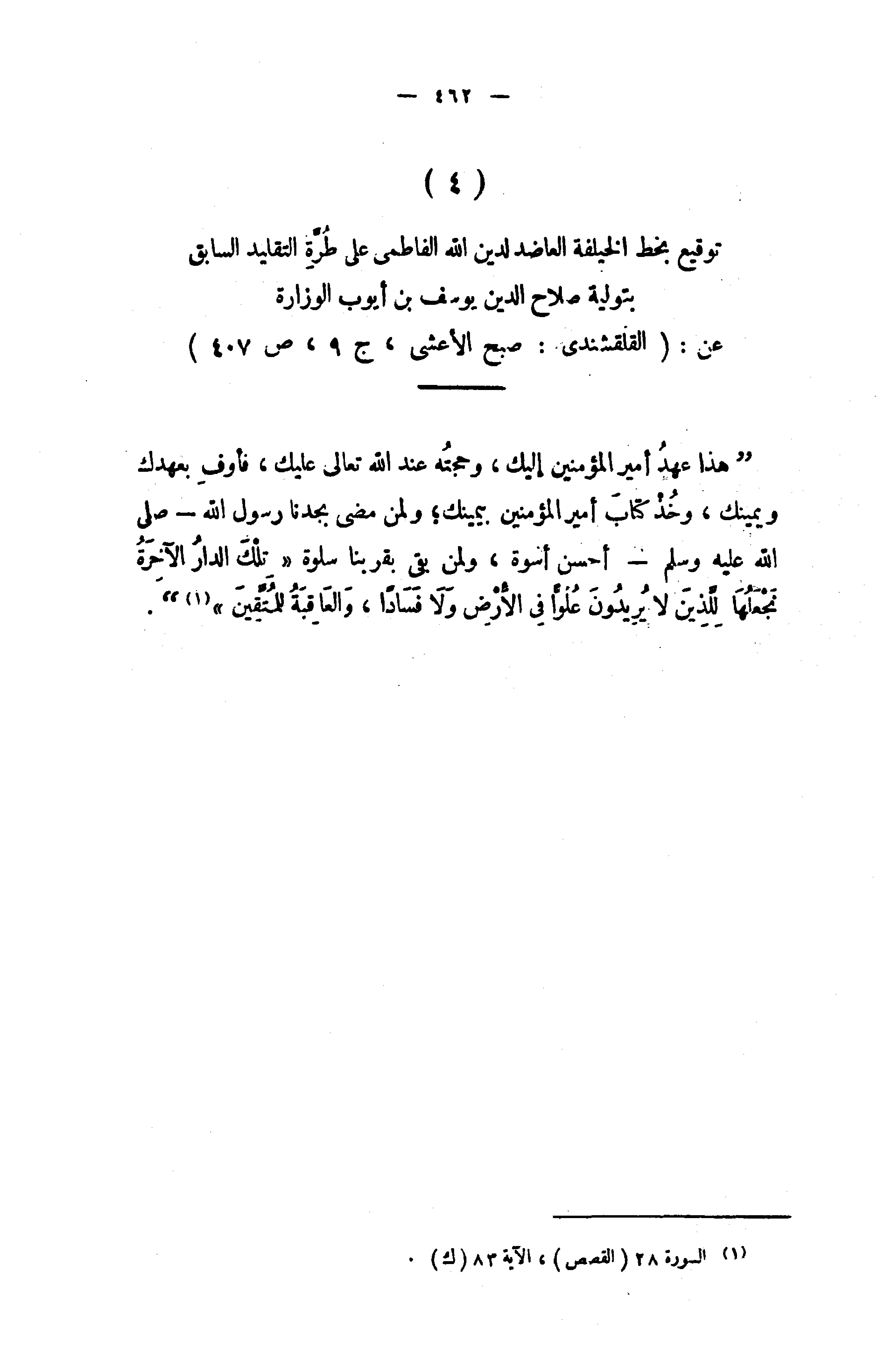 عن: (القلقشندى: صبح الأعشى، ج 9، ص 407) " هذا عهد أمير المؤمنين إليك، وحجته عند الله تعالى عليك، فأوف بعهدك ويمينك، وخذ كتاب أمير المؤمنين بيمينك؛ ولمن مضى بجدنا رسول الله - صلى الله عليه وسلم - أحسن أسوة، ولمن بقى بقربنا سلوة {تِلْكَ الدّارُ الْآخِرَةُ نَجْعَلُها لِلَّذِينَ لا يُرِيدُونَ عُلُوًّا فِي الْأَرْضِ وَلا فَساداً، وَالْعاقِبَةُ لِلْمُتَّقِينَ»} (¬1) ".
