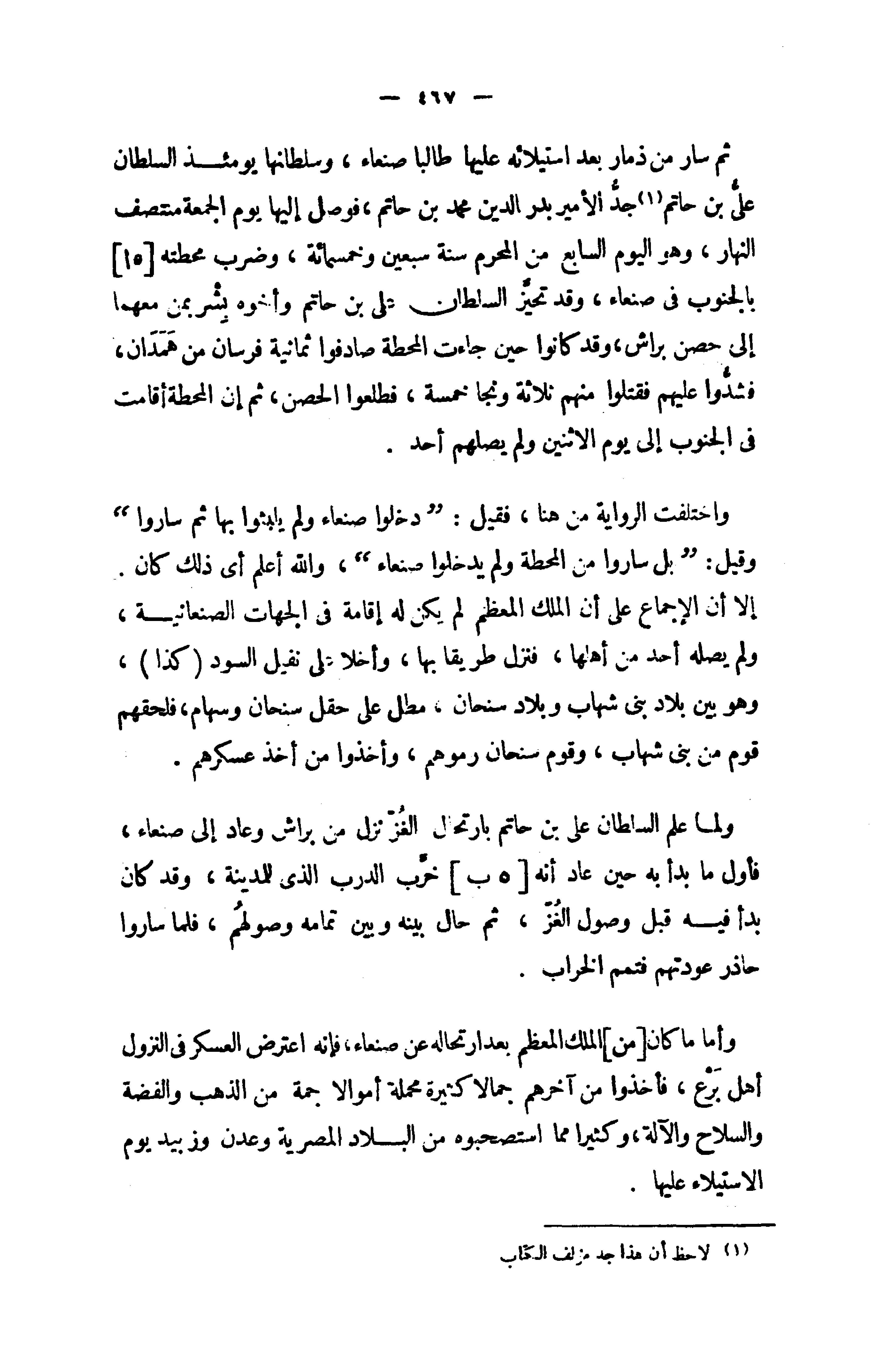 ولما علم السلطان على بن حاتم بارتحال الغزّ نزل من براش وعاد إلى صنعاء، فأول ما بدأ به حين عاد أنه [5 ب] خرّب الدرب الذى للمدينة، وقد كان بدأ فيه قبل وصول الغزّ، ثم حال بينه وبين تمامه وصولهم، فلما ساروا حاذر عودتهم فتمم الخراب.