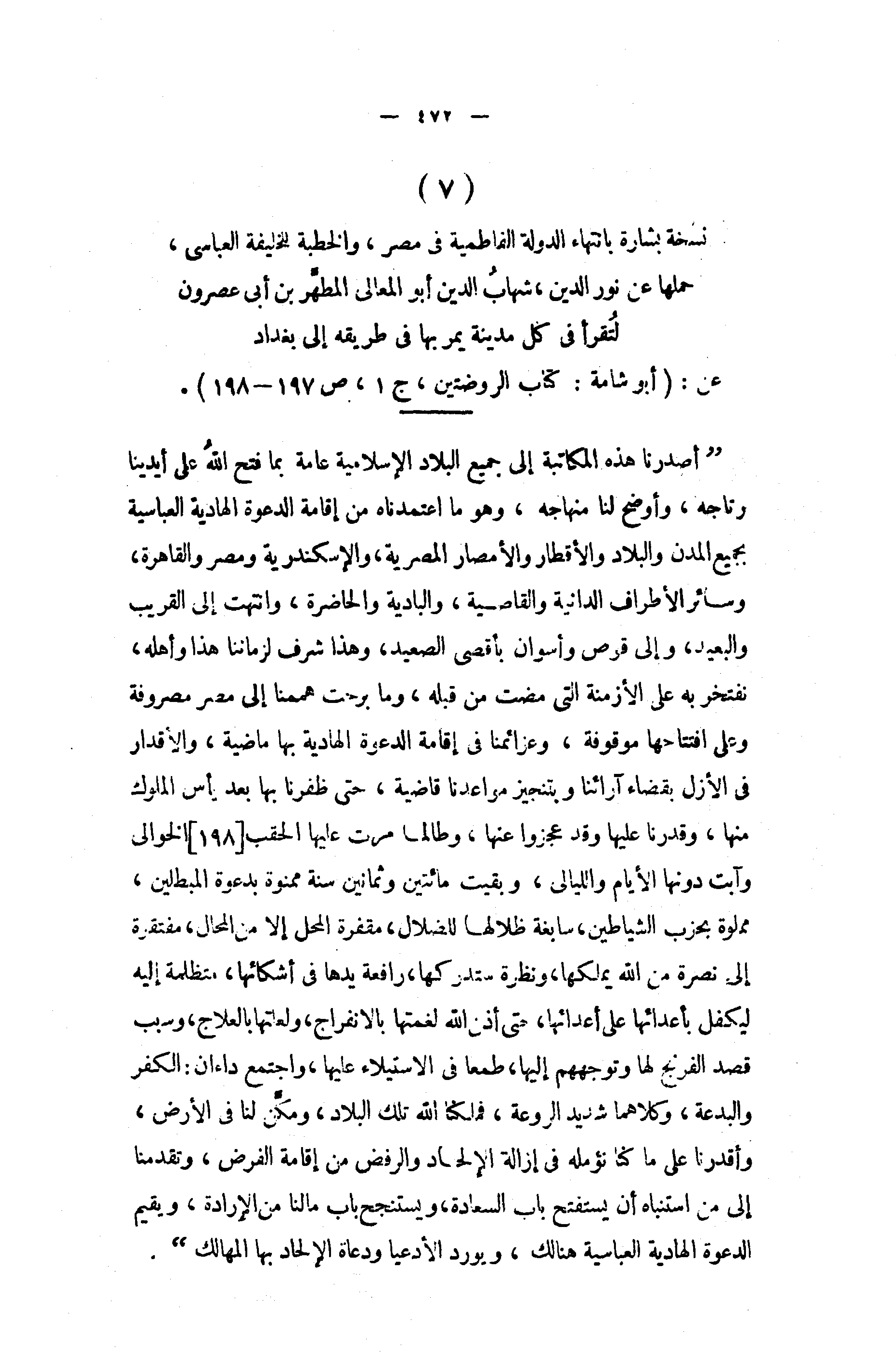 " أصدرنا هذه المكاتبة إلى جميع البلاد الإسلامية عامة بما فتح الله على أيدينا وتاجه، وأوضح لنا منهاجه، وهو ما اعتمدناه من إقامة الدعوة الهادية العباسية بجميع المدن والبلاد والأقطار والأمصار المصرية، والإسكندرية ومصر والقاهرة، وسائر الأطراف الدانية والقاصية، والبادية والحاضرة، وانتهت إلى القريب والبعيد، وإلى قوص وأسوان بأقصى الصعيد، وهذا شرف لزماننا هذا وأهله، نفتخر به على الأزمنة التي مضت من قبله، وما برحت هممنا إلى مصر مصروفة وعلى افتتاحها موقوفة، وعزائمنا في إقامة الدعوة الهادية بها ماضية، والأقدار في الأزل بقضاء آرائنا وبتنجيز مواعدنا قاضية، حتى ظفرنا بها بعد يأس الملوك منها، وقدرنا عليها وقد عجزوا عنها، وطالما مرت عليها الحقب [198] الخوالى وآبت دونها الأيام والليالى، وبقيت مائتين وثمانين سنة ممنوة بدعوة المبطلين، مملوة بحزب الشياطين، سابغة ظلالها للضلال، مقفرة المحل إلا من المحال، مفتقرة إلى نصرة من الله يملكها، ونظرة ستدركها، رافعة يدها في أشكائها، متظلمة إليه ليكفل بأعدائها على أعدائها، حتى أذن الله لغمتها بالانفراج، ولعلتها بالعلاج، وسبب قصد الفرنج لها وتوجههم إليها، طمعا في الاستيلاء عليها، واجتمع داءان: الكفر والبدعة، وكلاهما شديد الروعة، فملكنا الله تلك البلاد، ومكّن لنا في الأرض، وأقدرنا على ما كنا نؤمله في إزالة الإلحاد والرفض من إقامة الفرض، وتقدمنا إلى من استنباه أن يستفتح باب السعادة، ويستنجح باب مالنا من الإرادة، ويقيم الدعوة الهادية العباسية هنالك، ويورد الأدعيا ودعاة الإلحاد بها المهالك ".