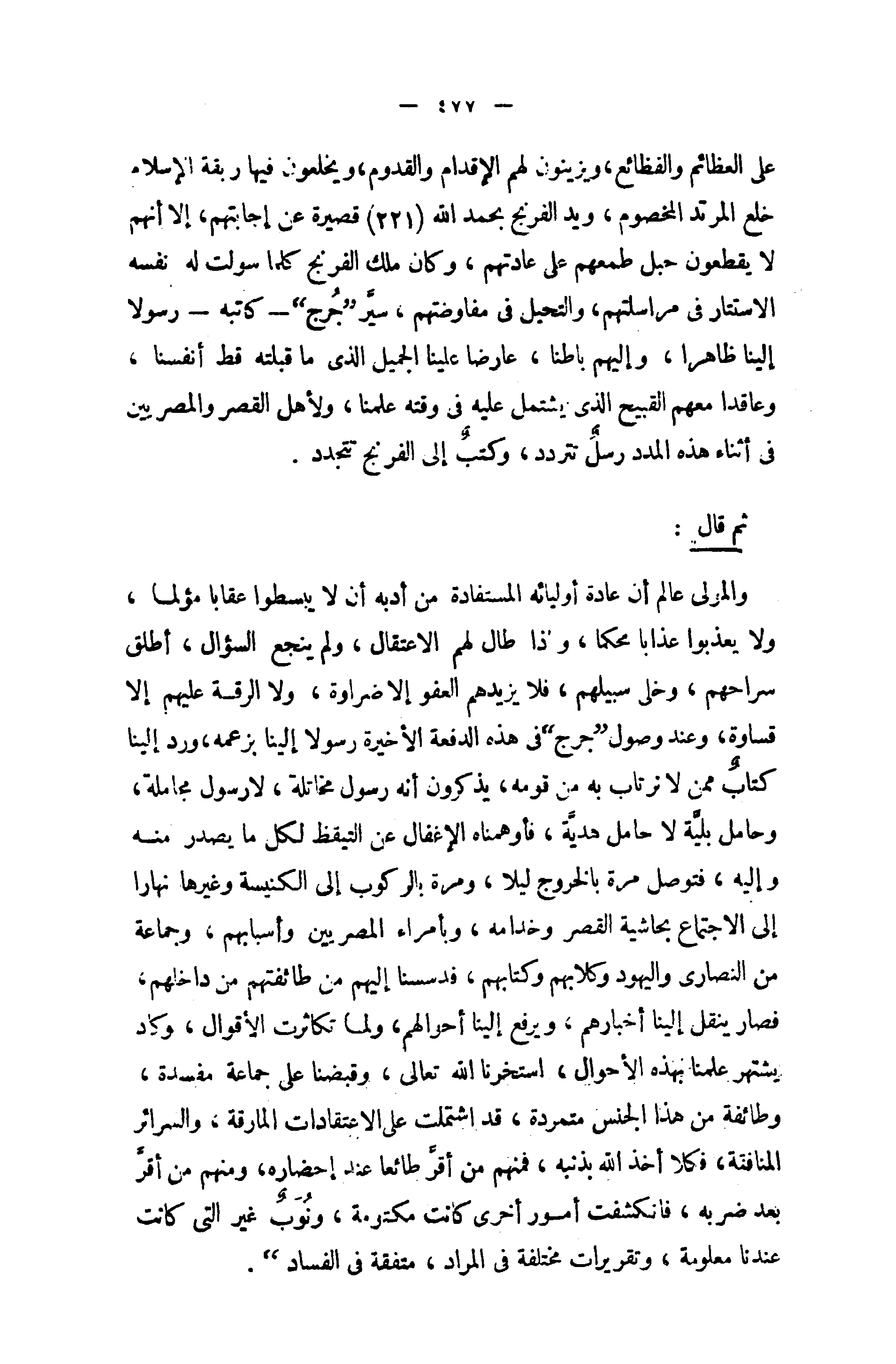 والمولى عالم أن عادة أوليائه المستفادة من أدبه أن لا يبسطوا عقابا مؤلما، ولا يعذبوا عذابا محكما، واذا طال لهم الاعتقال، ولم ينجع السؤال، أطلق سراحهم، وخلى سبيلهم، فلا يزيدهم العفو إلا ضراوة، ولا الرقة عليهم إلا قساوة، وعند وصول " جرج " في هذه الدفعة الأخيرة رسولا إلينا بزعمه، ورد إلينا كتاب ممن لا نرتاب به من قومه، يذكرون أنه رسول مخاتلة، لا رسول مجاملة، وحامل بليّة لا حامل هديّة، فأوهمناه الإغفال عن التيقظ لكل ما يصدر منه وإليه، فتوصل مرة بالخروج ليلا، ومرة بالركوب إلى الكنيسة وغيرها نهارا إلى الاجتماع بحاشية القصر وخدامه، وبأمراء المصريين وأسبابهم، وجماعة من النصارى واليهود وكلابهم وكتابهم، فدسسنا إليهم من طائفتهم من داخلهم، فصار ينقل إلينا أخبارهم، ويرفع إلينا أحوالهم، ولما تكاثرت الأقوال، وكاد يشتهر علمنا بهذه الأحوال، استخرنا الله تعالى، وقبضنا على جماعة مفسدة، وطائفة من هذا الجنس متمردة، قد اشتملت على الاعتقادات المارقة، والسرائر المنافتة، فكلا أخذ الله بذنبه، فمنهم من أقرّ طائعا عند إحضاره، ومنهم من أقرّ بعد ضربه، فانكشفت أمور أخرى كانت مكتومة، ونوب غير التي كانت عندنا معلومة، وتقريرات مختلفة في المراد، متفقة في الفساد ".