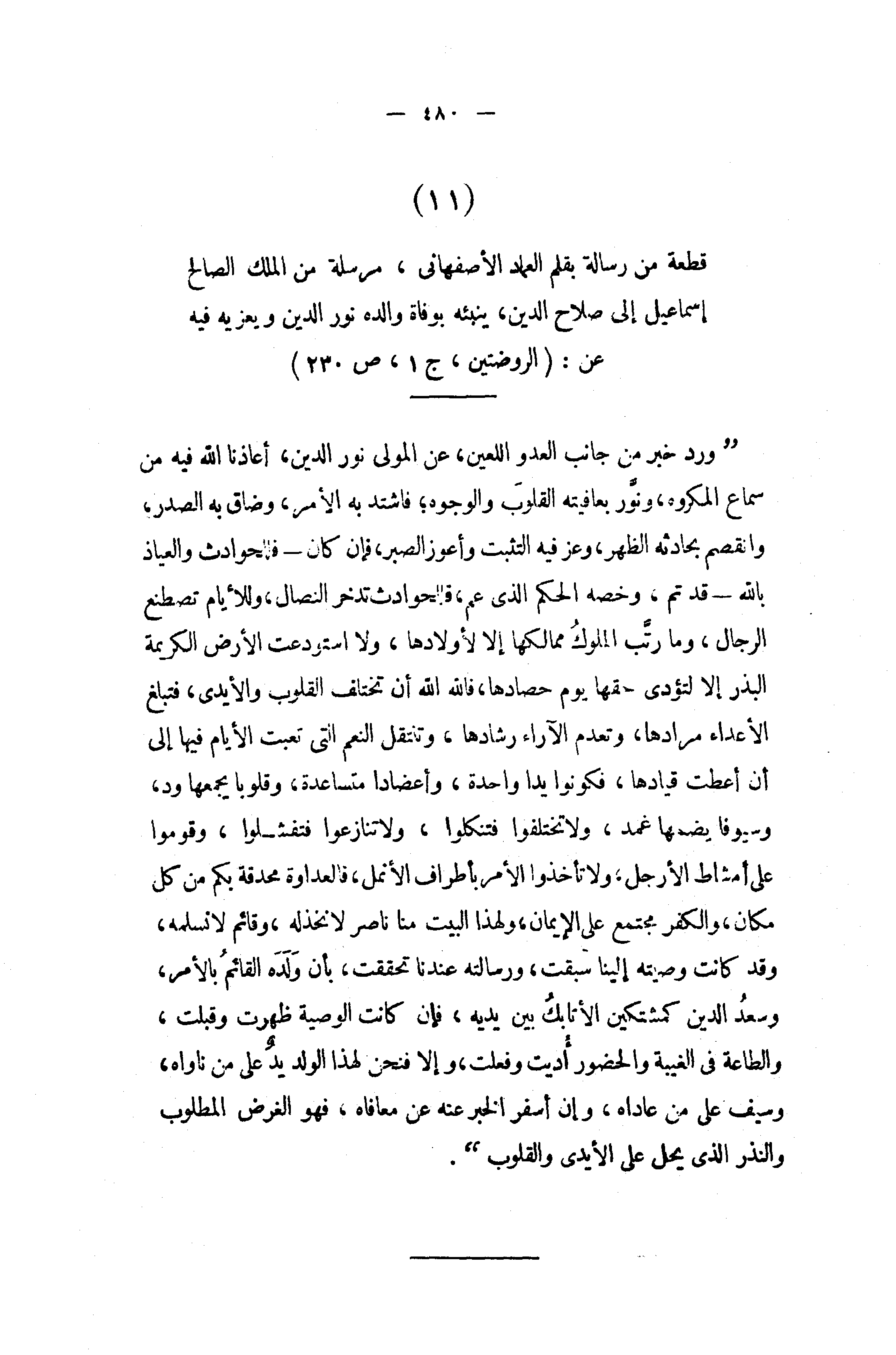 قطعة من رسالة بقلم العماد الأصفهانى، مرسلة من الملك الصالح إسماعيل إلى صلاح الدين، ينبئه بوفاة والده نور الدين ويعزيه فيه