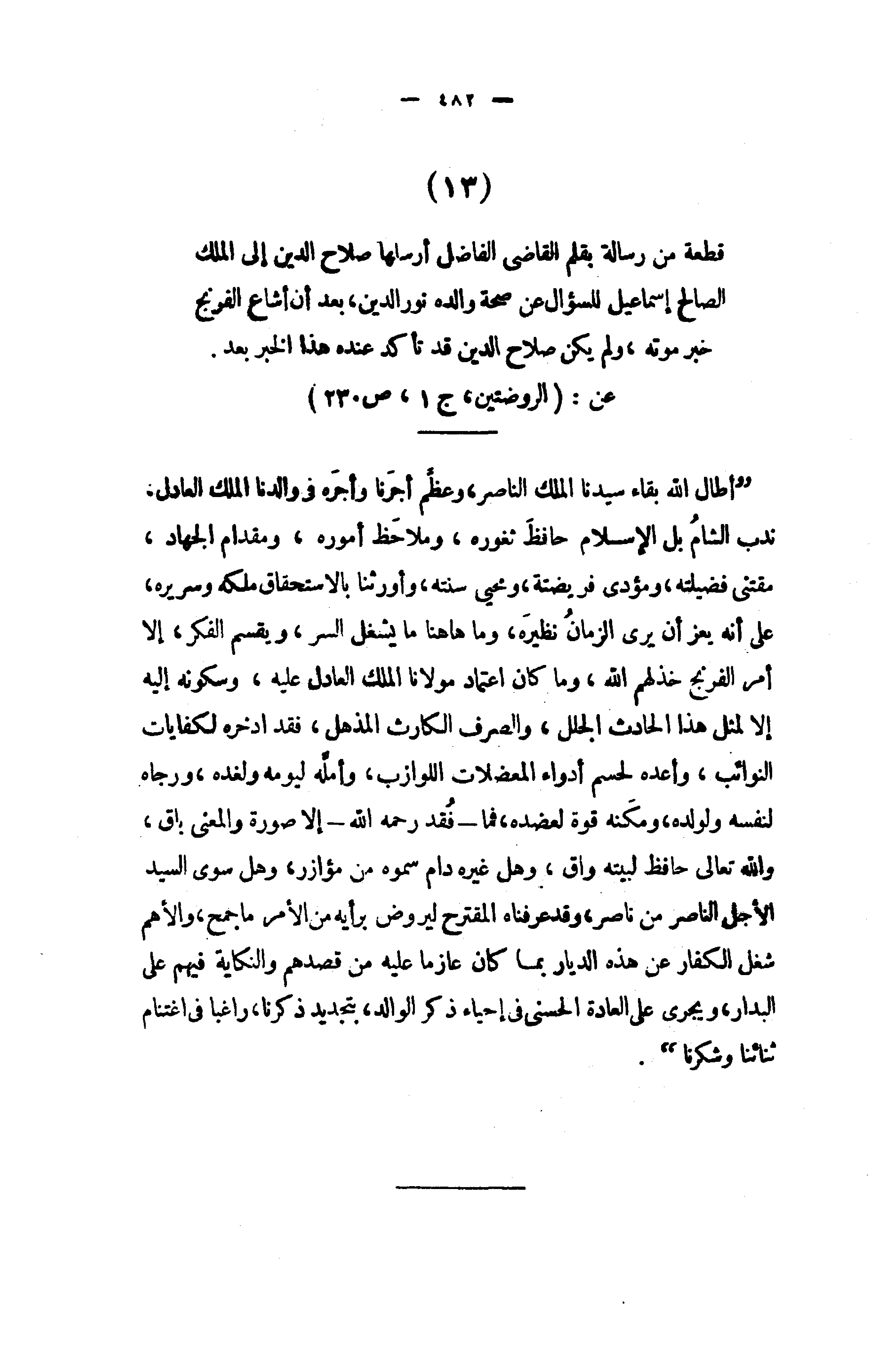قطعة من رسالة بقلم القاضى الفاضل أرسلها صلاح الدين إلى الملك الصالح إسماعيل للسؤال عن صحة والده نور الدين، بعد أن أشاع الفرنج خبر موته، ولم يكن صلاح الدين قد تأكد عنده هذا الخبر بعد