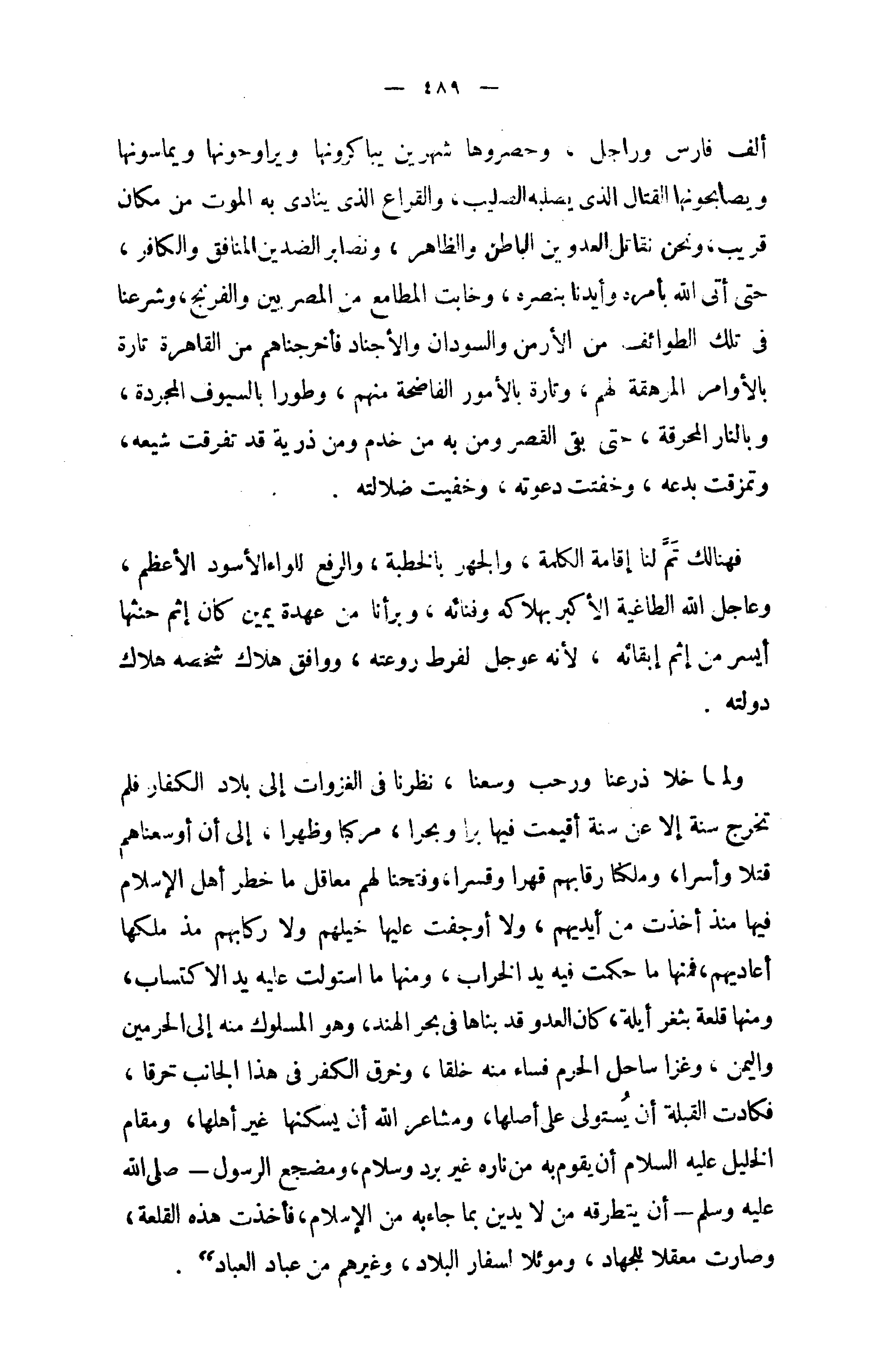 ألف فارس وراجل، وحصروها شهرين يباكرونها ويراوحونها ويماسونها ويصابحونها القتال الذى يصلبه الصليب، والقراع الذى ينادى به الموت من مكان قريب، ونحن نقاتل العدوين الباطن والظاهر، ونضابر الضدين المنافق والكافر، حتى أتى الله بأمره وأيدنا بنصره، وخابت المطامع من المصريين والفرنج، وشرعنا في تلك الطوائف من الأرمن والسودان والأجناد فأخرجناهم من القاهرة تارة بالأوامر المرهقة لهم، وتارة بالأمور الفاضحة منهم، وطورا بالسيوف المجردة، وبالنار المحرقة، حتى بقى القصر ومن به من خدم ومن ذرية قد تفرقت شيعه، وتمزقت بدعه، وخفتت دعوته، وخفيت ضلالته.