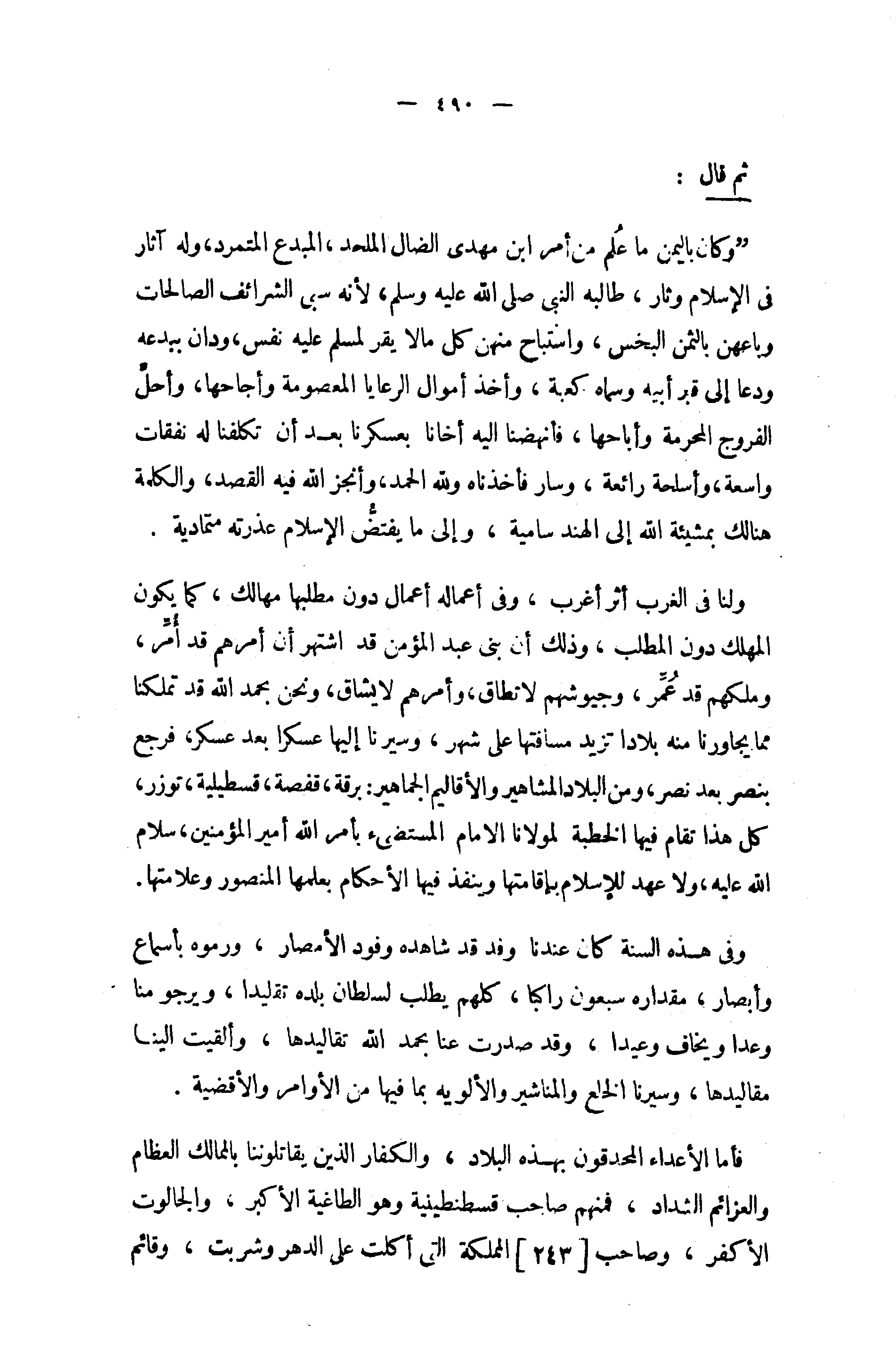 فأما الأعداء المحدقون بهذه البلاد، والكفار الذين يقاتلوننا بالممالك العظام والعزائم الشداد، فمنهم صاحب قسطنطينية وهو الطاغية الأكبر، والجالوت الأكفر، وصاحب [243] المملكة التي أكلت على الدهر وشربت، وقائم