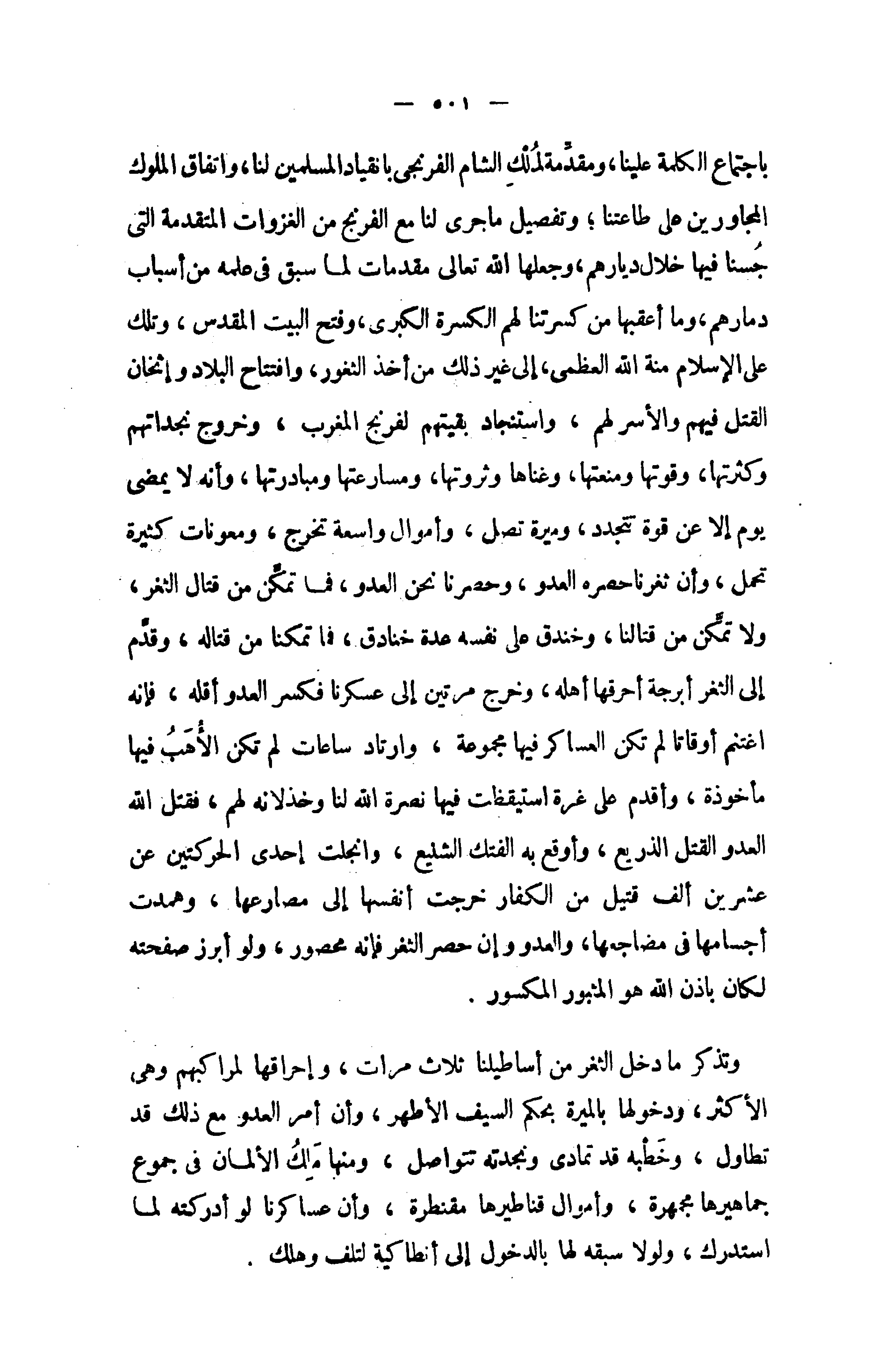 وتذكر ما دخل الثغر من أساطيلنا ثلاث مرات، وإحراقها لمراكبهم وهى الأكثر، ودخولها بالميرة بحكم السيف الأطهر، وأن أمر العدو مع ذلك قد تطاول، وخطبه قد تمادى ونجدته تتواصل، ومنها ملك الألمان في جموع جماهيرها مجمهرة، وأموال قناطيرها مقنطرة، وأن عساكرنا لو أدركته لما استدرك، ولولا سبقه لها بالدخول إلى أنطاكية لتلف وهلك.