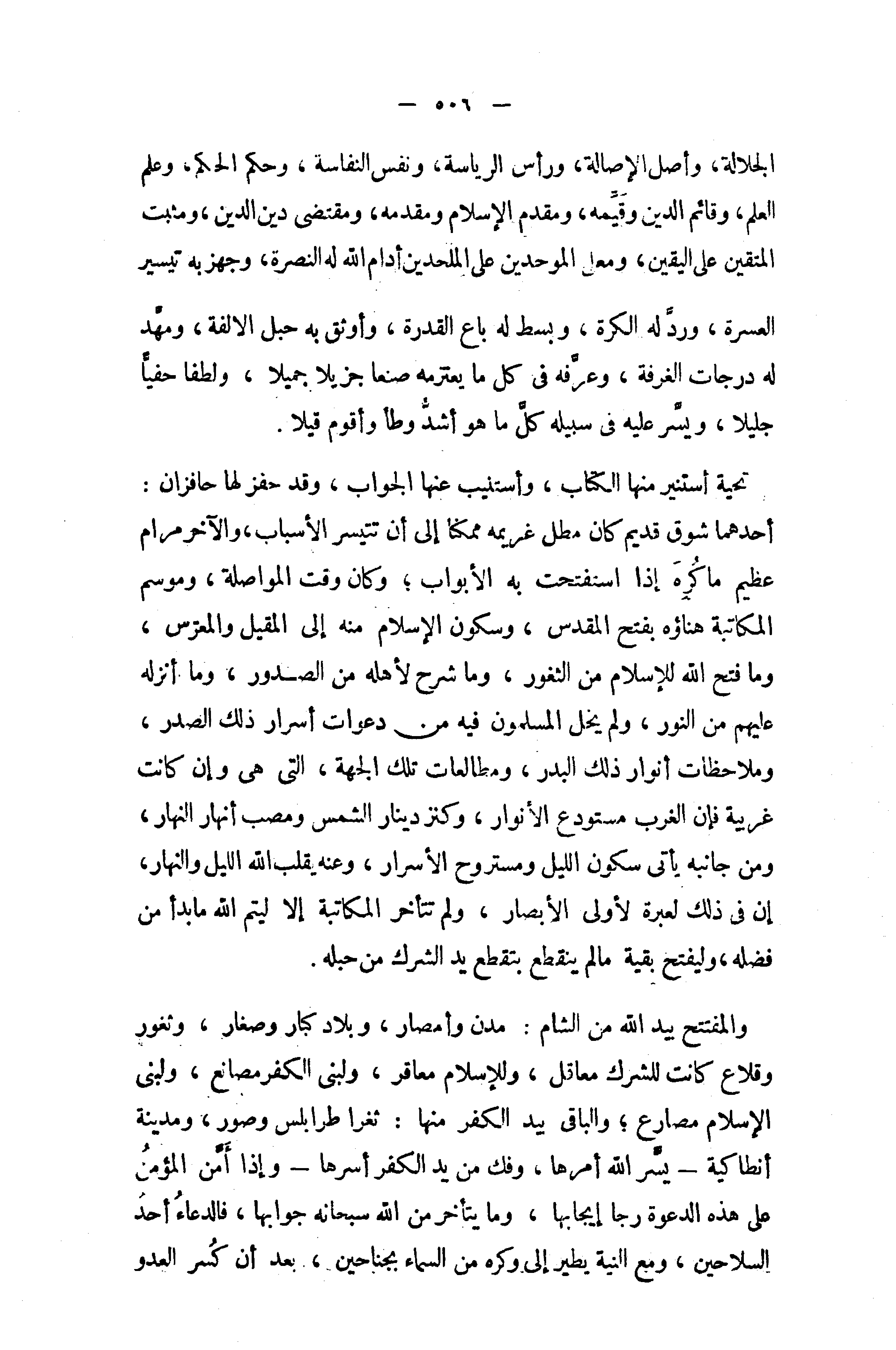 الجلالة، وأصل الإصالة، ورأس الرياسة، ونفس النفاسة، وحكم الحكم، وعلم العلم، وقائم الدين وقيّمه، ومقدم الإسلام ومقدمه، ومقتضى دين الدين، ومثبت المتقين على اليقين، ومعلى الموحدين على الملحدين أدام الله له النصرة، وجهز به تيسير العسرة، وردّ له الكرة، وبسط له باع القدرة، وأوثق به حبل الالفة، ومهّد له درجات الغرفة، وعرّفه في كل ما يعتزمه صنعا جزيلا جميلا، ولطفا حفيّا جليلا، ويسّر عليه في سبيله كلّ ما هو أشدّ وطأ وأقوم قيلا.