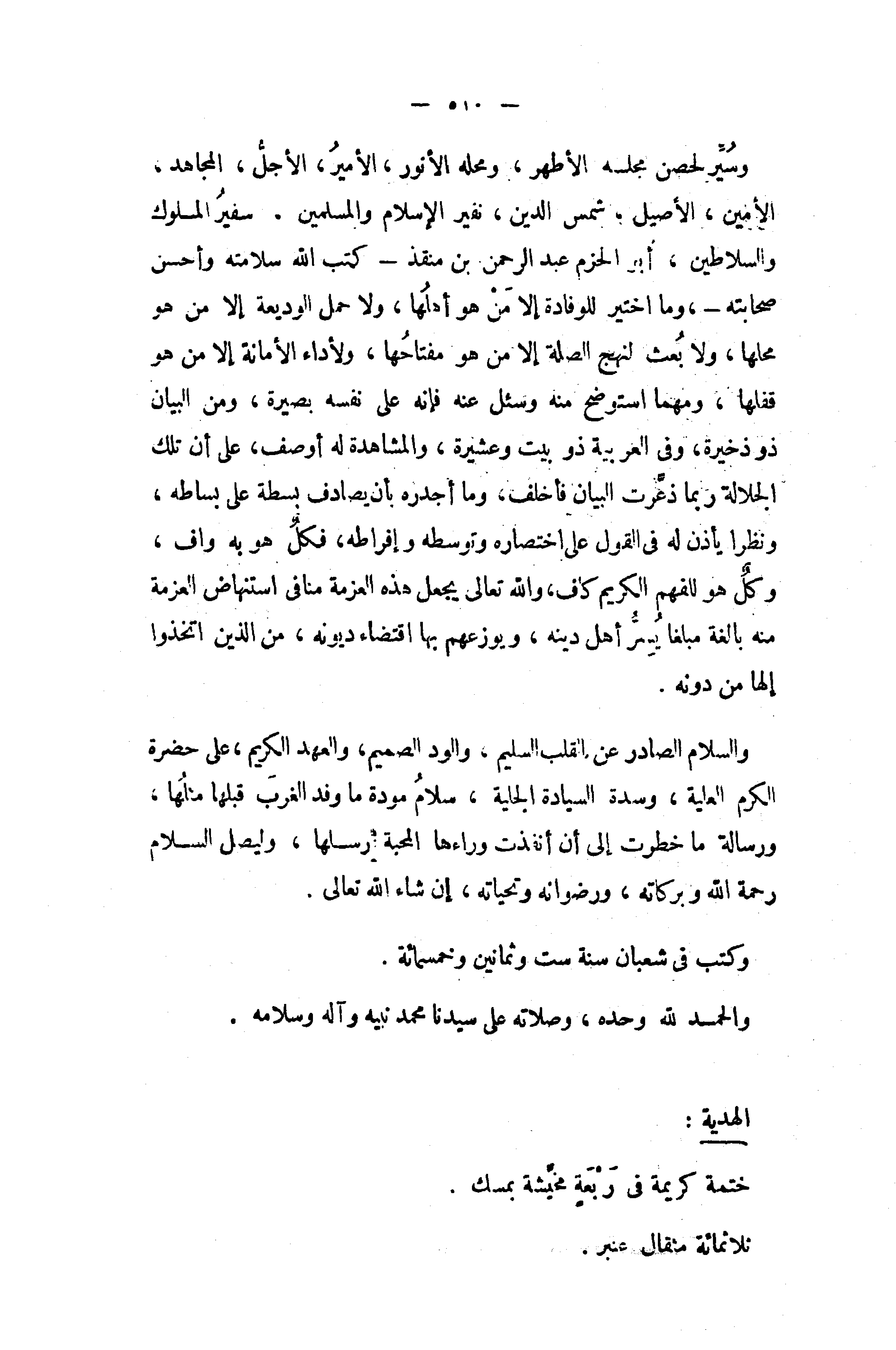 والسلام الصادر عن القلب السليم، والود الصميم، والعهد الكريم، على حضرة الكرم العلية، وسدة السيادة الجلية، سلام مودة ما وفد الغرب قبلها مثلها، ورسالة ما خطرت إلى أن أنفذت وراءها المحبة رسلها، وليصل السلام رحمة الله وبركاته، ورضوانه وتحياته، إن شاء الله تعالى.