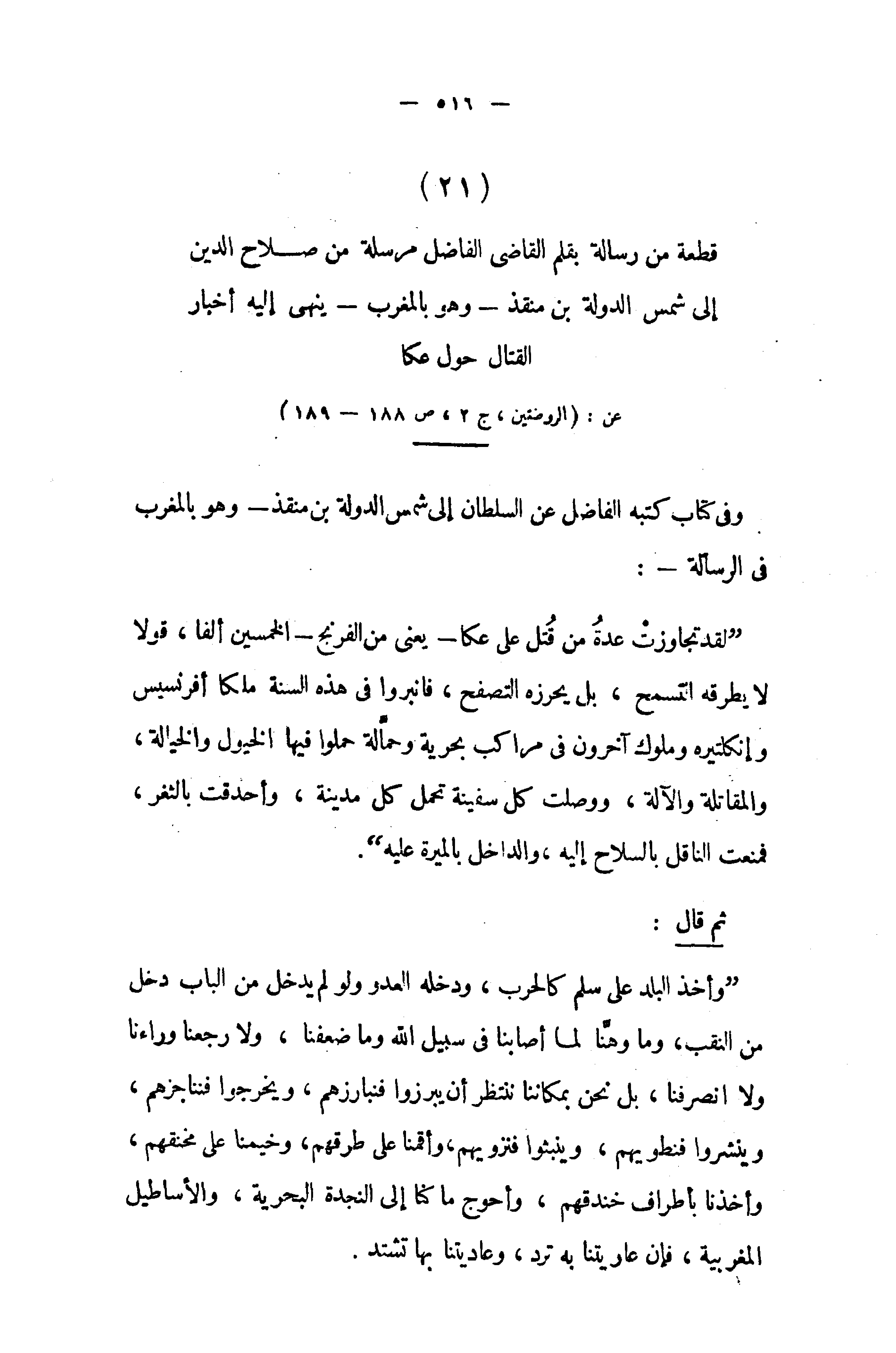 عن: (الروضتين، ج 2، ص 188 - 189) وفى كتاب كتبه الفاضل عن السلطان إلى شمس الدولة بن منقذ - وهو بالمغرب في الرسالة -: