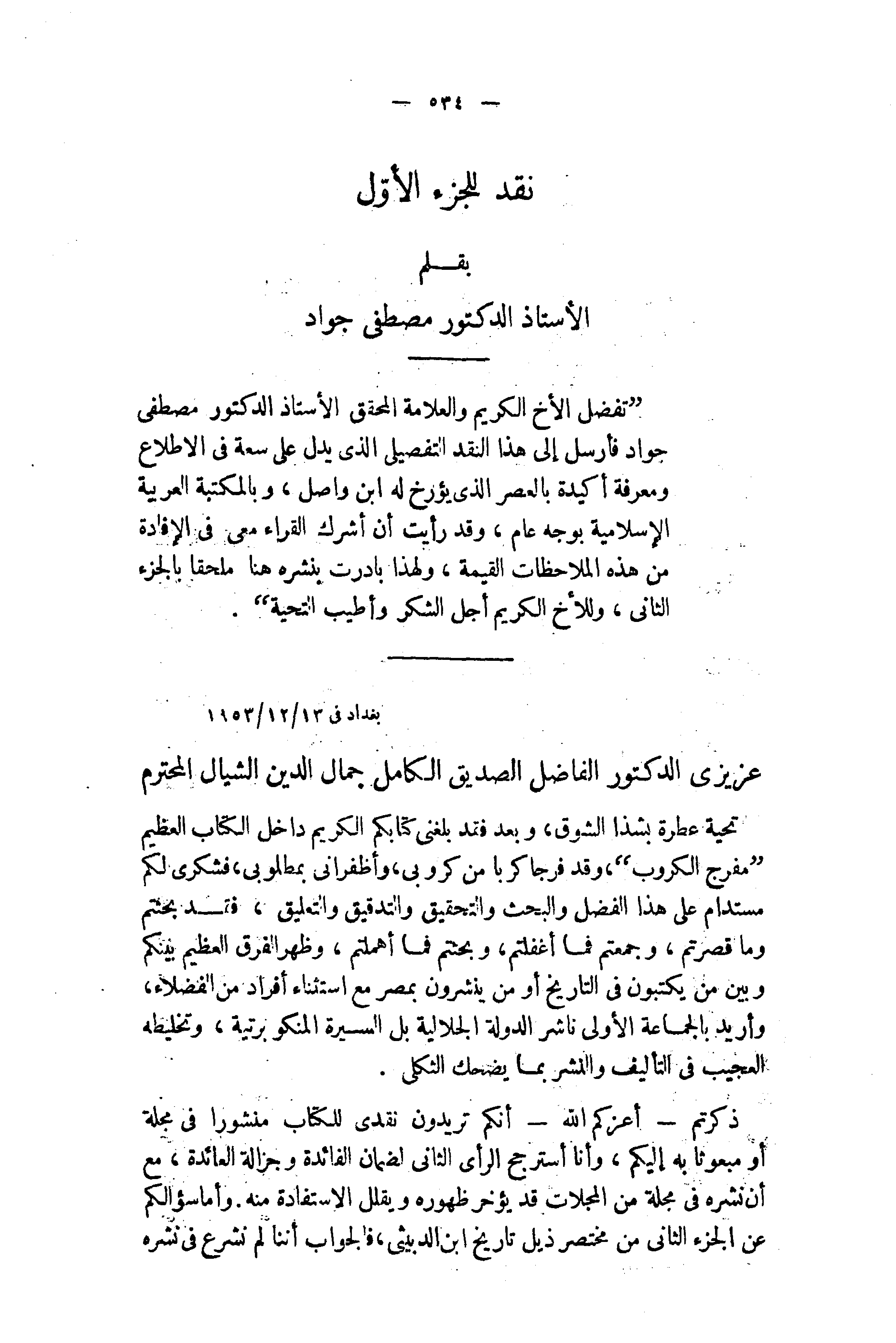 ذكرتم - أعزكم الله - أنكم تريدون نقدى للكتاب منشورا في مجلة أو مبعوثا به إليكم، وأنا أسترجح الرأى الثانى لضمان الفائدة وجزالة العائدة، مع أن نشره في مجلة من المجلات قد يؤخر ظهوره ويقلل الاستفادة منه. وأما سؤالكم عن الجزء الثانى من مختصر ذيل تاريخ ابن الدبيثى، فالجواب أننا لم نشرع في نشره