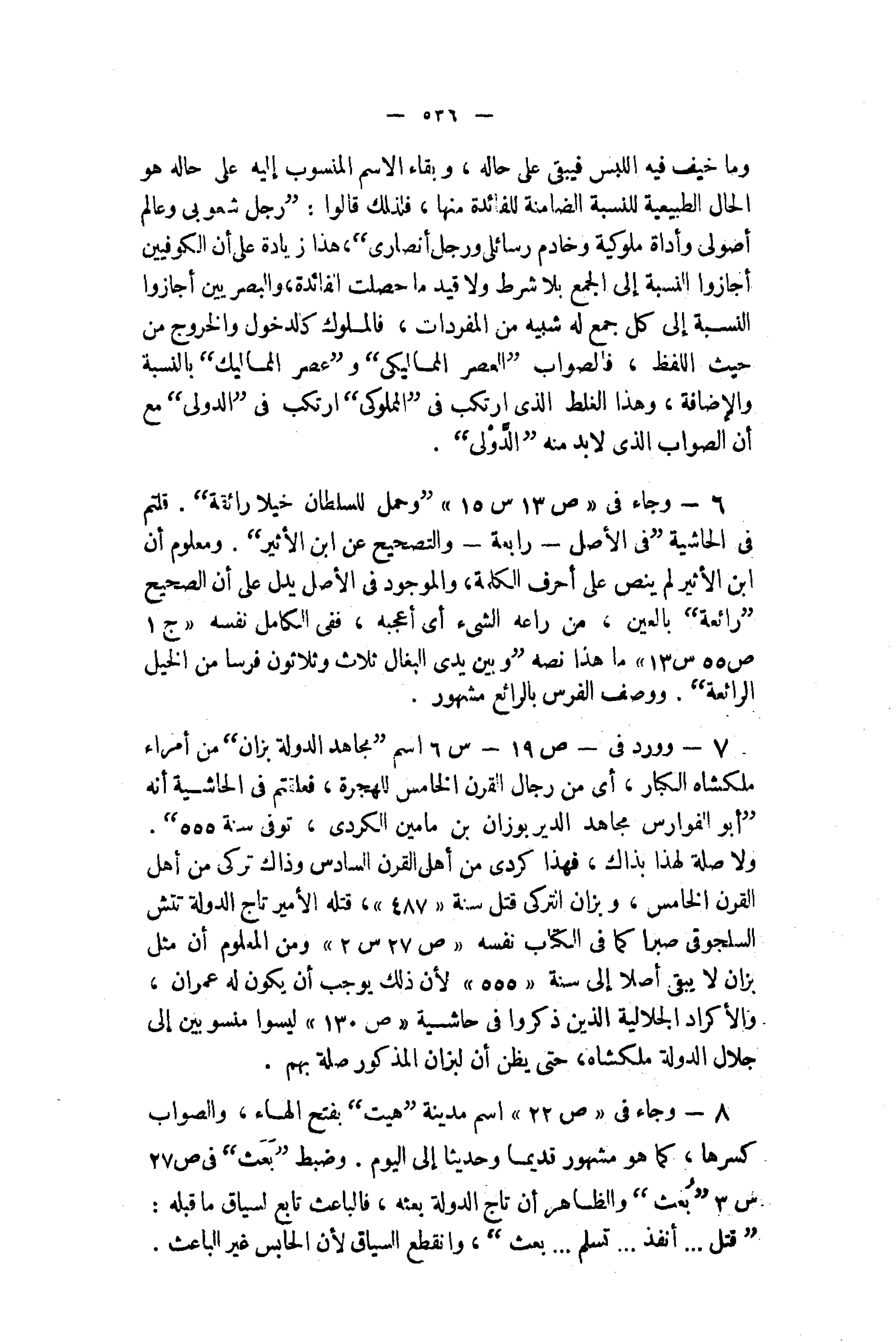 6 - وجاء في «ص 13 س 15» " وحمل للسلطان خيلا رائقة ". قلتم في الحاشية " في الأصل - رابعة - والتصحيح عن ابن الأثير ". ومعلوم أن ابن الأثير لم ينص على أحرف الكلمة، والموجود في الأصل يدل على أن الصحيح " رائعة " بالعين، من راعه الشئ أي أعجبه، ففى الكامل نفسه «ج 1 ص 55 س 13» ما هذا نصه " وبين يدى البغال ثلاث وثلاثون فرسا من الخيل الرائعة ". ووصف الفرس بالرائع مشهور.