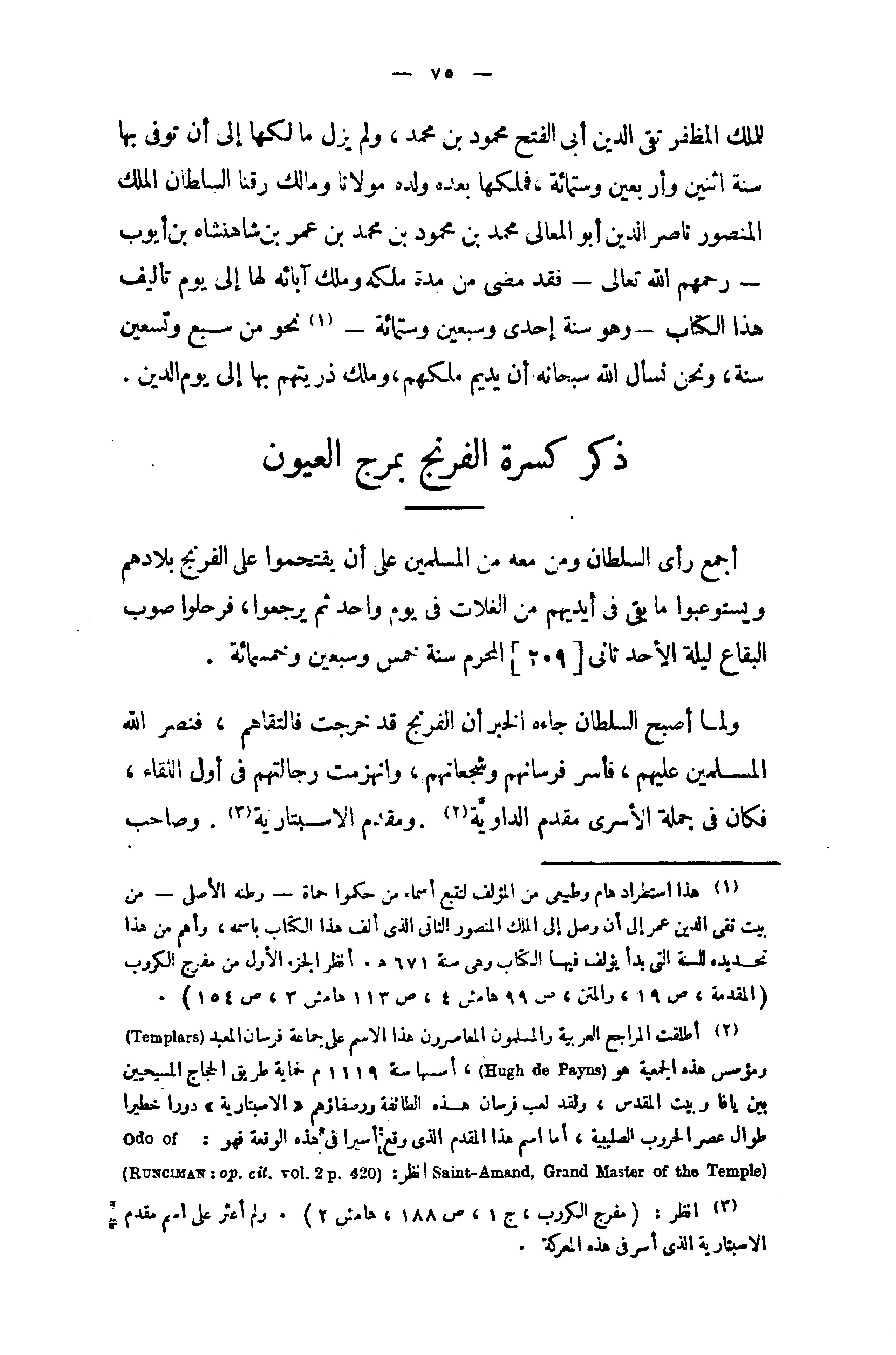 (¬2) أطلقت المراجع العربية والمسلمون المعاصرون هذا الاسم على جماعة فرسان المعبد (Templars) ومؤسس هذه الجمعية هو، (Hugh de payns) أسسها سنة 1119 م لحماية طريق الحجاج المسيحيين بين يافا وبيت المقدس، ولقد لعب فرسان هذه الطائفة ورصفاؤهم «الاسبتارية» دورا خطيرا طوال عصر الحروب الصليبية، أما اسم هذا المقدم الذى وقع أسيرا في هذه الوقعة فهو: