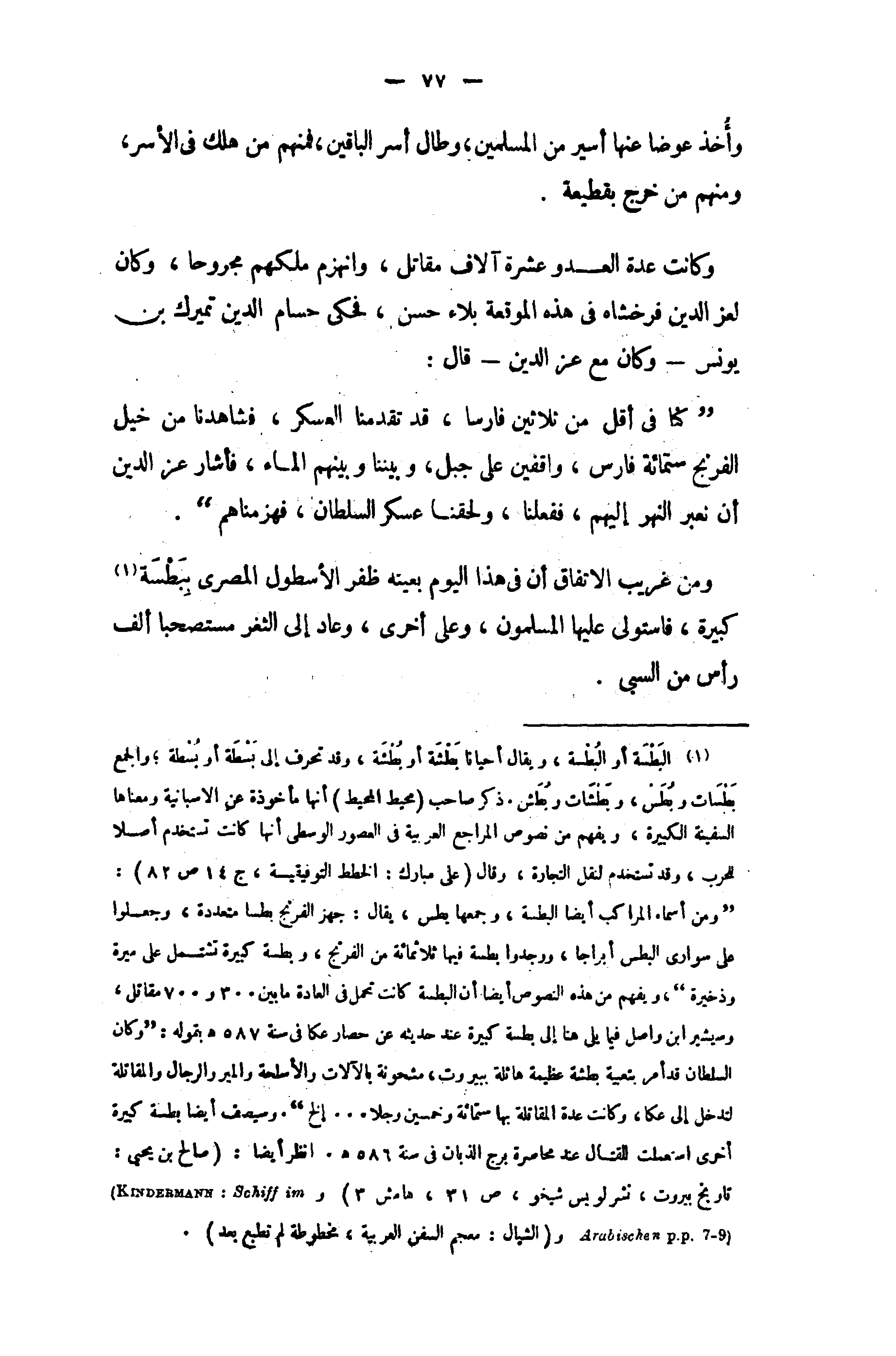 (¬1) البطسة أو البطسة، ويقال أحيانا بطشة أو بطشة، وقد تحرف إلى بسطة أو بسطة؛ والجمع بطسات وبطس، وبطشات وبطش. ذكر صاحب (محيط المحيط) أنها مأخوذة عن الاسبانية ومعناها السفينة الكبيرة، ويفهم من نصوص المراجع العربية في العصور الوسطى أنها كانت تستخدم أصلا للحرب، وقد تستخدم لنقل التجارة، وقال (على مبارك: الخطط التوفيقية، ج 14 ص 82): " ومن أسماء المراكب أيضا البطسة، وجمعها بطس، يقال: جهز الفرنج بطسا متعددة، وجعلوا على سوارى البطس أبراجا، ووجدوا بطسة فيها ثلاثمائة من الفرنج، وبطسة كبيرة تشتمل على ميرة وذخيرة "، ويفهم من هذه النصوص أيضا أن البطسة كانت تحمل في العادة ما بين 300 و 700 مقاتل، وسيشير ابن واصل فيما يلى هنا إلى بطسة كبيرة عند حديثه عن حصار عكا في سنة 587 هـ بقوله: " وكان السلطان قد أمر بتعبية بطشة عظيمة هائلة ببيروت، مشحونة بالآلات والأسلحة والمير والرجال والمقاتلة لتدخل إلى عكا، وكانت عدة المقاتلة بها ستمائة وخمسين رجلا. . . إلخ ". وسيصف أيضا بطسة كبيرة أخرى استعملت للقتال عند محاصرة برج الذبان في سنة 586 هـ. انظر أيضا: (صالح بن يحيى: تاريخ بيروت، نشر لويس شيخو، ص 31، هامش 3) و (KINDERMANN : Schiff im Arabischen P. P. 7 - 9) و (الشيال: معجم السفن العربية، مخطوطة لم تطبع بعد).