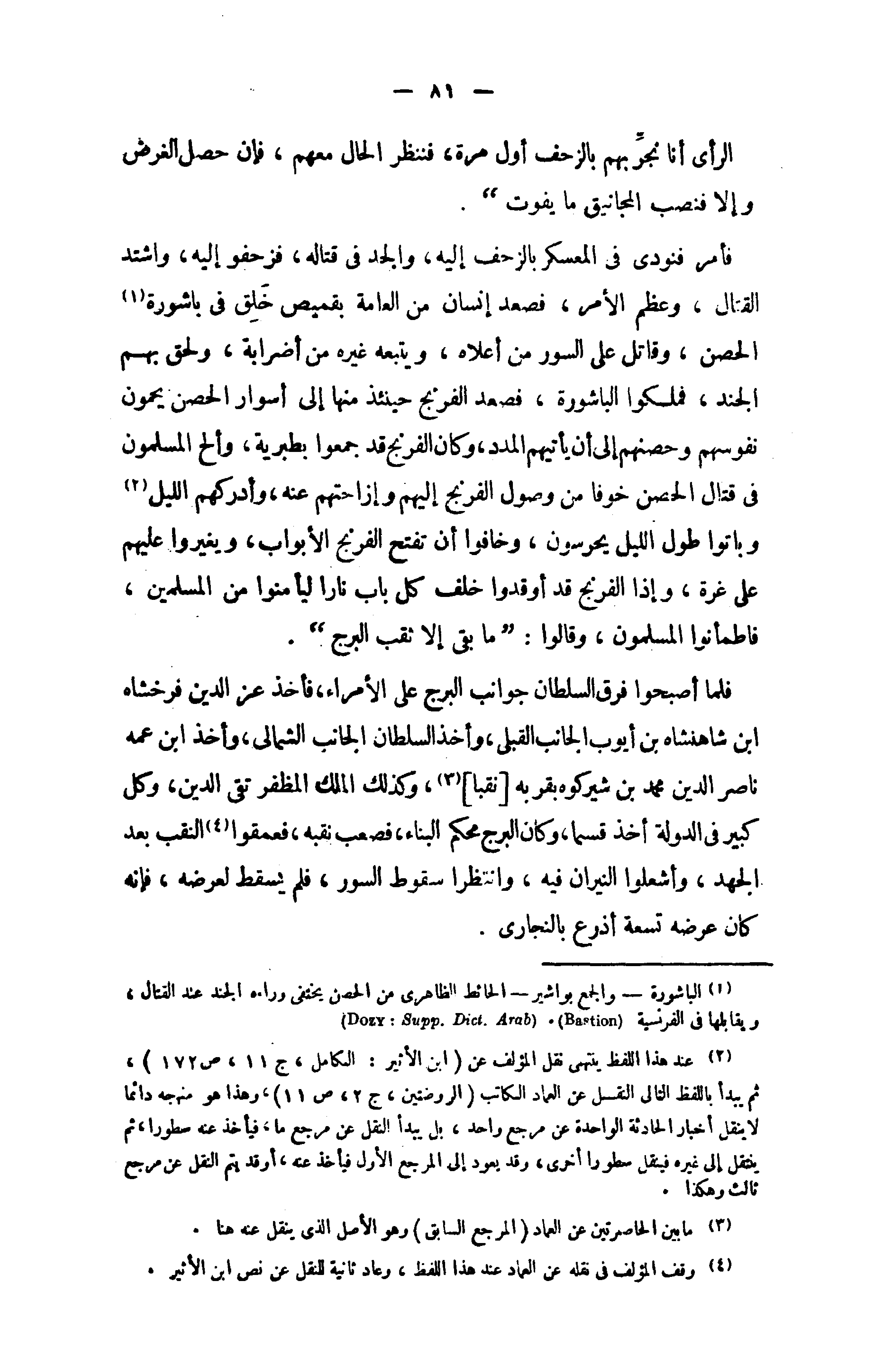 (¬2) عند هذا اللفظ ينتهى نقل المؤلف عن (ابن الأثير: الكامل، ج 11، ص 172)، ثم يبدأ باللفظ التالى النقل عن العماد الكاتب (الروضتين، ج 2، ص 11)، وهذا هو منهجه دائما لا ينقل أخبار الحادثة الواحدة عن مرجع واحد، بل يبدأ النقل عن مرجع ما، فيأخذ عنه سطورا، ثم ينتقل إلى غيره فينقل سطورا أخرى، وقد يعود إلى المرجع الأول فيأخذ عنه، أو قد يتم النقل عن مرجع ثالث وهكذا.