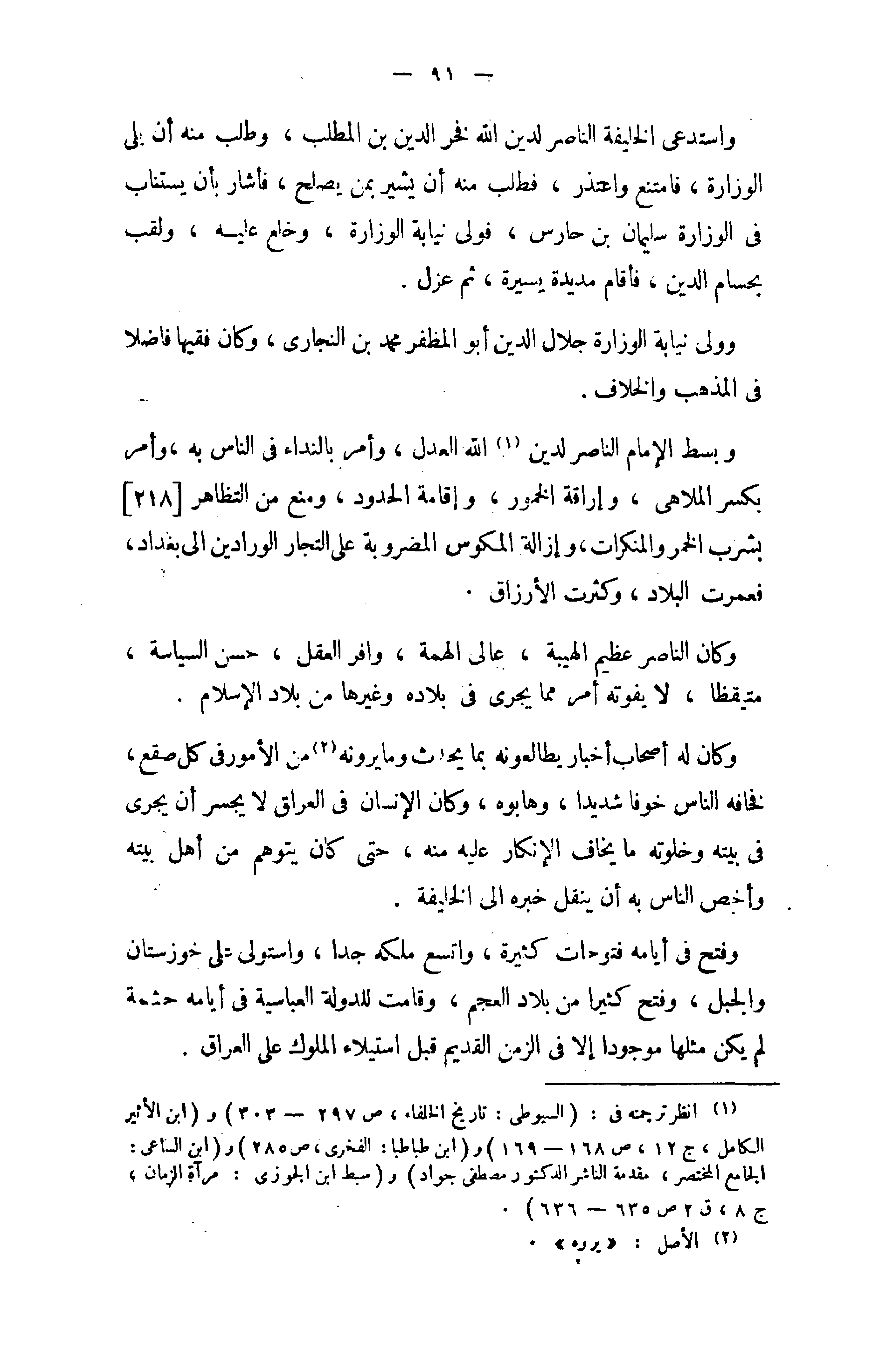 (¬1) انظر ترجمته في: (السيوطى: تاريخ الخلفاء، ص 297 - 303) و (ابن الأثير الكامل، ج 12، ص 168 - 169) و (ابن طباطبا: الفخرى، ص 285) و (ابن الساعى: الجامع المختصر، مقدمة الناشر الدكتور مصطفى جواد) و (سبط ابن الجوزى: مرآة الزمان، ج 8، ق 2 ص 635 - 636).