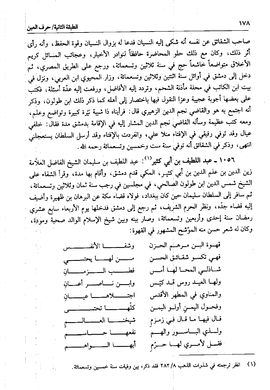 عبد اللطيف بن سليمان الشيخ الفاضل العلامة زين الدين بن علم الدين بن أبي كثير، المكي قدم دمشق، وأقام بها مدة، وقرأ الشفاء على الشيخ شمس الدين ابن طولون الصالحي، في مجلسين في رجب سنة ثمان وثلاثين وتسعمائة، ثم سافر إلى السلطان سليمان حين كان ببغداد، فولاه قضاء مكة عن البرهان بن ظهيرة وأضيف إليه قضاء جده، ونظر الحرم الشريف، ثم رجع إلى دمشق فدخلها يوم الأربعاء سابع عشري رمضان سنة إحدى وأربعين وتسعمائة، وصار بينه وبين شيخ الإسلام الوالد صحبة ومودة، وكان له شعر حسن منه الموشح المشهور في القهوة:
