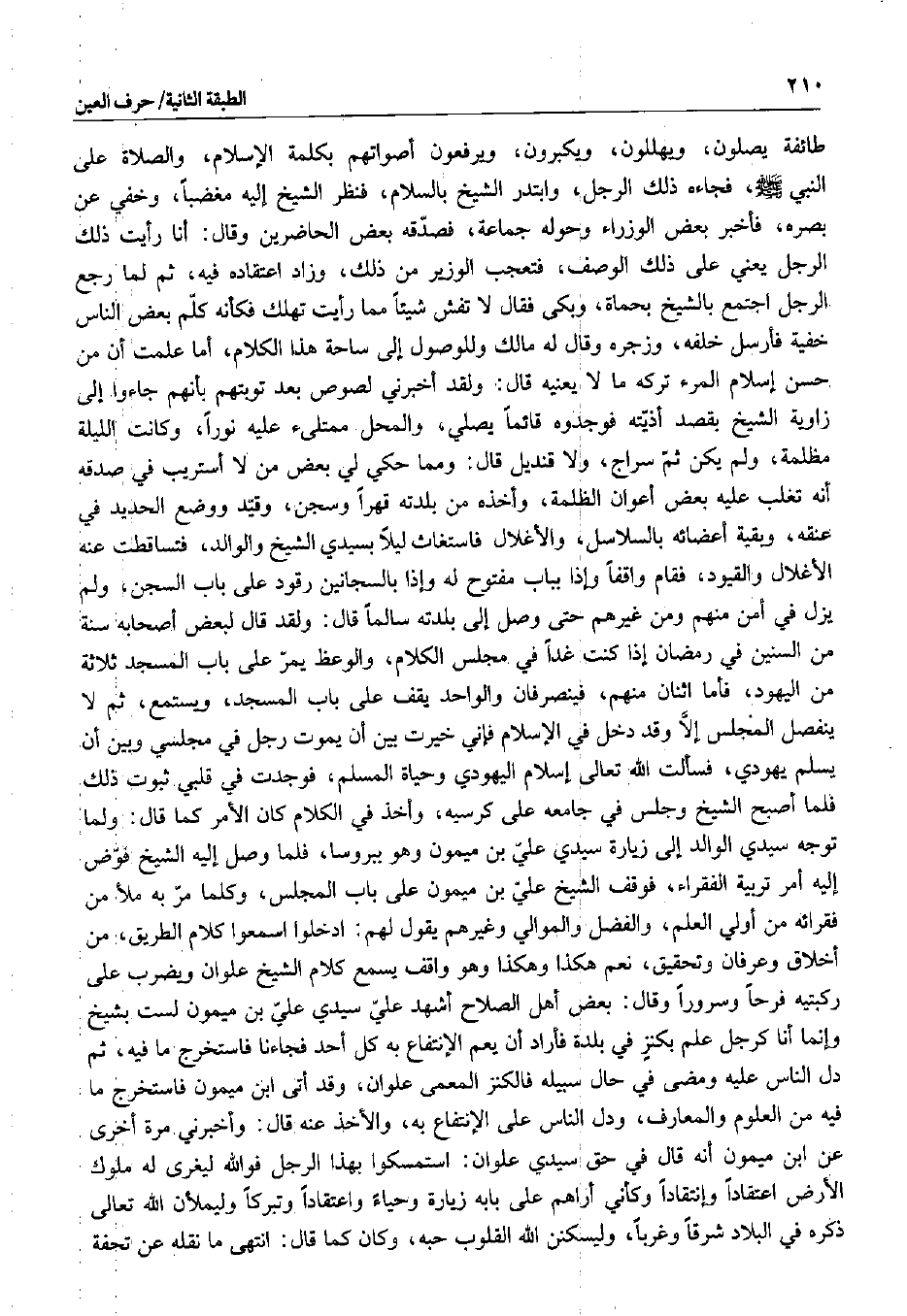 طائفة يصلون، ويهللون، ويكبرون، ويرفعون أصواتهم بكلمة الإسلام، والصلاة على النبي صلى الله عليه وسلم، فجاءه ذلك الرجل، وابتدر الشيخ بالسلام، فنظر الشيخ إليه مغضباً، وخفي عن بصره، فأخبر بعض الوزراء وحوله جماعة، فصدقه بعض الحاضرين وقال: أنا رأيت ذلك الرجل يعني على ذلك الوصف، فتعجب الوزير من ذلك، وزاد اعتقاده فيه، ثم لما رجع الرجل اجتمع بالشيخ بحماة، وبكى فقال لا تفش شيئاً مما رأيت تهلك فكأنه كلم بعض الناس خفية فأرسل خلفه، وزجره وقال له مالك وللوصول إلى ساحة هذا الكلام، أما علمت أن من حسن إسلام المرء تركة ما لا يعنيه قال:. ولقد أخبرني لصوص بعد توبتهم بأنهم جاءوا إلى زاوية الشيخ بقصد أذيته فوجدوه قائماً يصلي، والمحل ممتلىء عليه نوراً، وكانت الليلة مظلمة، ولم يكن ثم سراج، ولا قنديل قال: ومما حكي لي بعض من لا أستريب في صدقه أنه تغلب عليه بعض أعوان الظلمة، وأخذه من بلدته قهراً وسجن، وقيد ووضع الحديد في عنقه، وبقية أعضائه بالسلاسل، والأغلال فاستغاث ليلاً بسيدي الشيخ والوالد، فتساقطت عنه الأغلال والقيود، فقام واقفاً وإذا بباب مفتوح له وإذا بالسجانين رقود على باب السجن، ولم يزل في أمن منهم ومن غيرهم حتى وصل إلى بلدته سالماً قال: ولقد قال