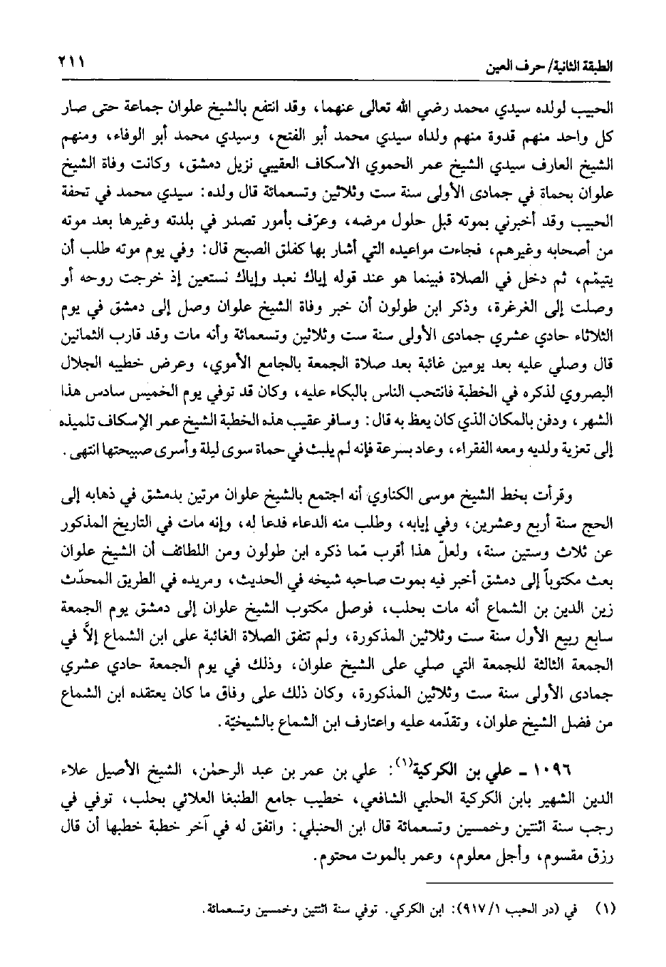 وقرأت بخط الشيخ موسى الكناوي أنه اجتمع بالشيخ علوان مرتين بدمشق في ذهابه إلى الحج سنة أربع وعشرين، وفي إيابه، وطلب منه الدعاء فدعا له، وإنه مات في التاريخ المذكور عن ثلاث وستين سنة، ولعل هذا أقرب مما ذكره ابن طولون ومن اللطائف أن الشيخ علوان بعث مكتوباً إلى دمشق أخبر فيه بموت صاحبه شيخه في الحديث، ومريده في الطريق المحدث زين الدين بن الشماع أنه مات بحلب، فوصل مكتوب الشيخ علوان إلى دمشق يوم الجمعة سابع ربيع الأول سنة ست وثلاثين المذكورة، ولم تتفق الصلاة الغائبة على ابن الشماع إلا في الجمعة الثالثة للجمعة التي صلي على الشيخ علوان، وذلك في يوم الجمعة حادي عشري جمادى الأولى سنة ست وثلاثين المذكورة، وكان ذلك على وفاق ما كان يعتقده ابن الشماع من فضل الشيخ علوان، وتقدمه عليه واعتارف ابن الشماع بالشيخية.
