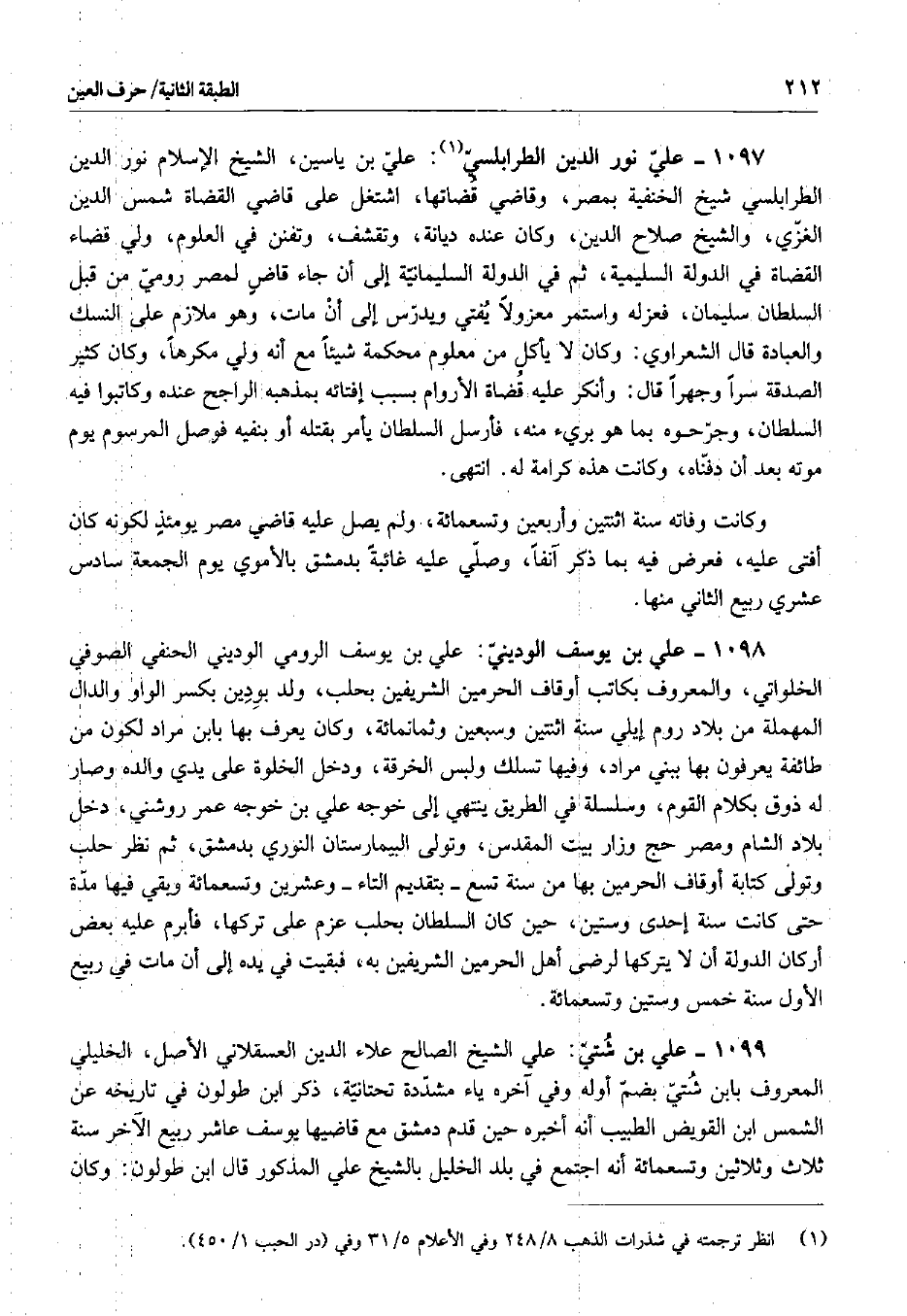 علي بن ياسين، الشيخ الإسلام نور الدين الطرابلسي شيخ الحنفية بمصر، وقاضي قضاتها، اشتغل على قاضي القضاة شمس الدين الغزي، والشيخ صلاح الدين، وكان عنده ديانة، وتقشف، وتفنن في العلوم، ولي قضاء القضاة في الدولة السليمية، ثم في الدولة السليمانية إلى أن جاء قاض لمصر رومي من قبل السلطان سليمان، فعزله واستمر معزولاً يفتي ويدرس إلى أن مات، وهو ملازم على النسك والعبادة قال الشعراوي: وكان لا يأكل من معلوم محكمة شيئاً مع أنه ولي مكرهاً، وكان كثير الصدقة سراً وجهراً قال: وأنكر عليه قضاة الأروام بسبب إفتائه بمذهبه الراجح عنده وكاتبوا فيه السلطان، وجرحوه بما هو بريء منه، فأرسل السلطان يأمر بقتله أو بنفيه فوصل المرسوم يوم موته بعد أن دفناه، وكانت هذه كرامة له. انتهى.