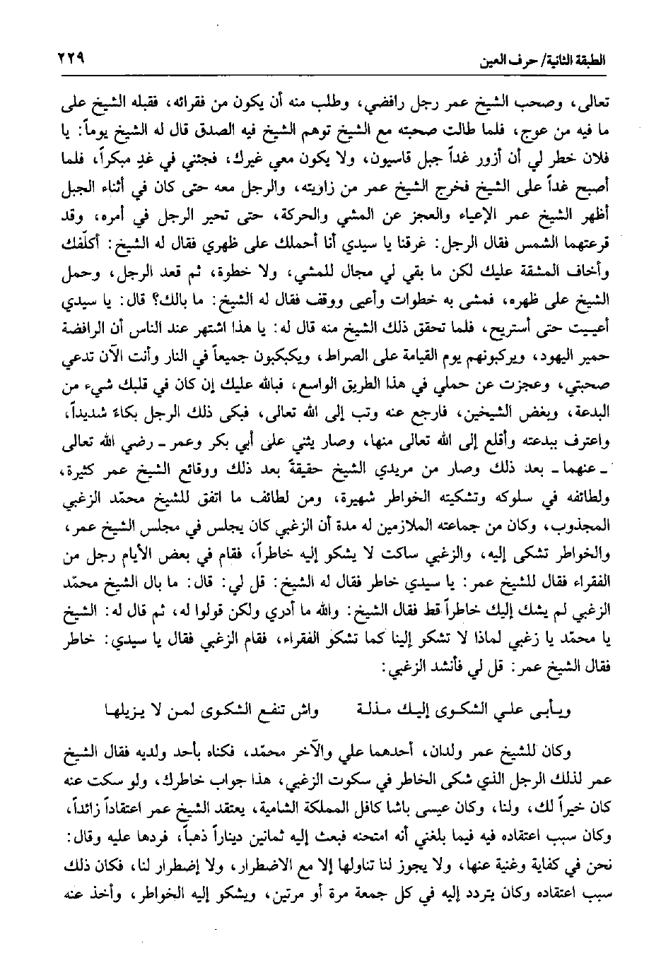 تعالى، وصحب الشيخ عمر رجل رافضي، وطلب منه أن يكون من فقرائه، فقبله الشيخ على ما فيه من عوج، فلما طالت صحبته مع الشيخ توهم الشيخ فيه الصدق قال له الشيخ يوماً: يا فلان خطر لي أن أزور غداً جبل قاسيون، ولا يكون معي غيرك، فجئني في غد مبكراً، فلما أصبح غداً على الشيخ فخرج الشيخ عمر من زاويته، والرجل معه حتى كان في أثناء الجبل أظهر الشيخ عمر الإعياء والعجز عن المشي والحركة، حتى تحير الرجل في أمره، وقد قرعتهما الشمس فقال الرجل: غرقنا يا سيدي أنا أحملك على ظهري فقال له الشيخ: أكلفك وأخاف المشقة عليك لكن ما بقي لي مجال للمشي، ولا خطوة، ثم قعد الرجل، وحمل الشيخ على ظهره، فمشى به خطوات وأعيى ووقف فقال له الشيخ: ما بالك. قال: يا سيدي أعييت حتى أستريح، فلما تحقق ذلك الشيخ منه قال له: يا هذا اشتهر عند الناس أن الرافضة حمير اليهود، ويركبونهم يوم القيامة على الصراط، ويكبكبون جميعاً في النار وأنت الآن تدعي صحبتي، وعجزت عن حملي في هذا الطريق الواسع، فبالله عليك إن كان في قلبك شيء من البدعة، وبغض الشيخين، فارجع عنه وتب إلى الله تعالى، فبكى ذلك الرجل بكاء شديداً، واعترف ببدعته وأقلع إلى الله تعالى منها، وصار يثني على أبي بكر وعمر رضي الله تعالى عنهما بعد ذلك وصار من مريدي الشيخ حقيقة بعد ذلك ووقائع الشيخ عمر كثيرة، ولطائفه في سلوكه وتشكيته الخواطر شهيرة، ومن لطائف ما اتفق للشيخ محمد الزغبي المجذوب، وكان من جماعته الملازمين له مدة أن الزغبي كان يجلس في مجلس الشيخ عمر، والخواطر تشكى إليه، والزغبي ساكت لا يشكو إليه خاطراً، فقام في بعض الأيام رجل من الفقراء فقال للشيخ عمر: يا سيدي خاطر فقال له الشيخ: قل لي: قال: ما بال الشيخ محمد الزغبي لم يشك إليك خاطراً قط فقال الشيخ: والله ما أدري ولكن قولوا له، ثم قال له: الشيخ يا محمد يا زغبي لماذا لا تشكو إلينا كما تشكو الفقراء، فقام الزغبي فقال يا سيدي: خاطر فقال الشيخ عمر: قل لي فأنشد الزغبي: