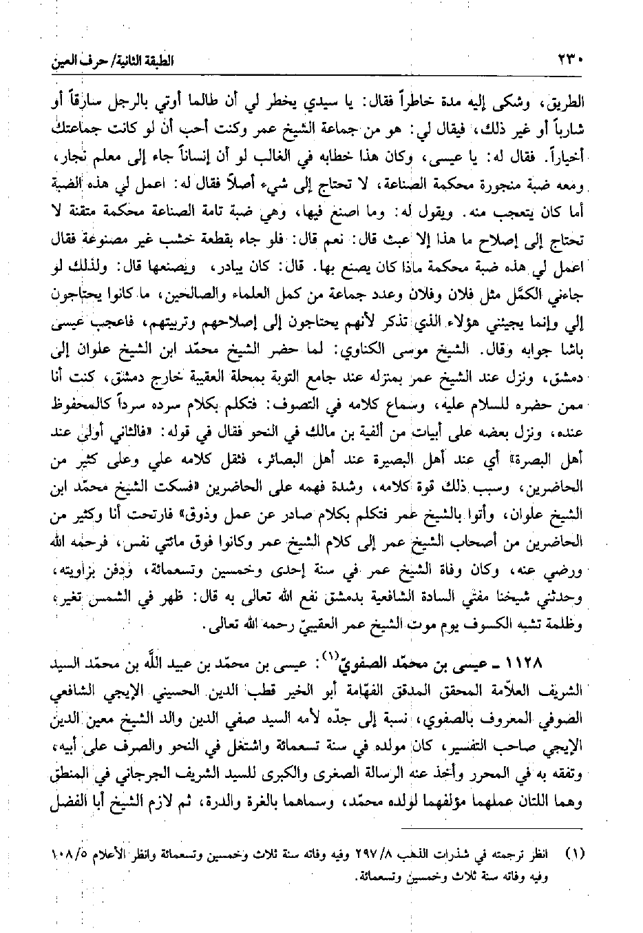 الطريق، وشكى إليه مدة خاطراً فقال: يا سيلي يخطر لي أن طالما أوتي بالرجل سارقاً أو شارباً أو غير ذلك، فيقال لي: هو من جماعة الشيخ عمر وكنت أحب أن لو كانت جماعتك أخياراً. فقال له: يا عيسى، وكان هذا خطابه في الغالب لو أن إنساناً جاء إلى معلم نجار، ومعه ضبة منجورة محكمة الصناعة، لا تحتاج إلى شيء أصلاً فقال له: اعمل لي هذه الضبة أما كان يتعجب منه. ويقول له: وما أصنع فيها، وهي ضبة تامة الصناعة محكمة متقنة لا تحتاج إلى إصلاح ما هذا إلا عبث قال: نعم قال: فلو جاء بقطعة خشب غير مصنوعة فقال اعمل لي هذه ضبة محكمة ماذا كان يصنع بها. قال: كان يبادر، ويصنعها قال: ولذلك لو جاءني الكمل مثل فلان وفلان وعدد جماعة من كمل العلماء والصالحين، ما كانوا يحتاجون إلي وإنما يجيئني هؤلاء الذي تذكر لأنهم يحتاجون إلى إصلاحهم وتربيتهم، فأعجب عيسى باشا جوابه وقال. الشيخ موسى الكناوي: لما حضر الشيخ محمد ابن الشيخ علوان إلى دمشق، ونزل عند الشيخ عمر بمنزله عند جامع التوبة بمحلة العقيبة خارج دمشق، كنت أنا ممن حضره للسلام عليه، وسماع كلامه في التصوف: فتكلم بكلام سرده سرداً كالمحفوظ عنده، ونزل بعضه على أبيات من ألفية بن مالك في النحو فقال في قوله: " فالثاني أولى عند أهل البصرة " أي عند أهل البصيرة عند أهل البصائر، فثقل كلامه علي وعلى كثير من الحاضرين، وسبب ذلك قوة كلامه، وشدة فهمه على الحاضرين " فسكت الشيخ محمد ابن الشيخ علوان، وأتوا بالشيخ عمر فتكلم بكلام صادر عن عمل وفوق أفارتحت أنا وكثير ممن الحاضرين من أصحاب الشيخ عمر إلى كلام الشيخ عمر وكانوا فوق مائتي نفس، فرحمه الله ورضي عنه، وكان وفاة الشيخ عمر في سنة إحدى وخمسين وتسعمائة، ودفن بزاويته، وحدثني شيخنا مفتي السادة الشافعية بدمشق نفع الله تعالى به قال: ظهر في الشمس تغير، وظلمة تشبه الكسوف يوم موت الشيخ عمر العقيبي رحمه الله تعالى.