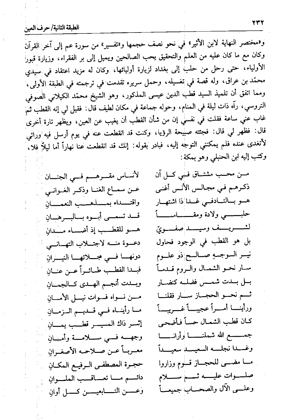 ومختصر النهاية لابن الأثير في نحو نصف حجمها وتفسير من سورة عم إلى آخر القرآن وكان مع ما كان عليه من العلم والتحقيق يحب الصالحين ويميل إلى بر الفقراء، وزيارة قبور الأولياء، حتى رحل من حلب إلى بغداد لزيارة أوليائها، وكان له مزيد اعتقاد في سيدي محمد بن عراق، وله قصة في تغسيله، وحمل سريره تقدمت في ترجمته في الطبقة الأولى، ومما اتفق أن تلميذ السيد قطب الدين عيسى المذكور، وهو الشيخ محمد الكيلاني الصوفي التروسي، رآه ذات ليلة في المنام، وحوله جماعة في مكان لطيف قال: فقيل لي إنه القطب ثم غاب عني ساعة فقلت في نفسي إن من شأن القطب أن يغيب عن العين، ويظهر تارة أخرى قال: فظهر لي قال: فجئته صبيحة الرؤيا، وكنت قد انقطعت عنه في يوم أرسل فيه ورائي لأتغدى عنده فلم يمكنني التوجه إليه، فبادر بقوله: