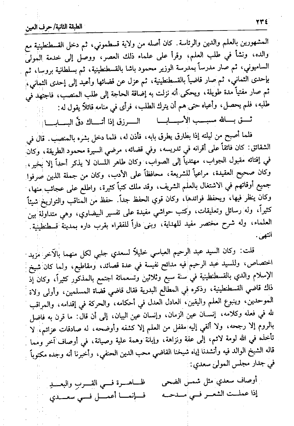 قلت: وكان السيد عبد الرحيم العباسي خليلاً لسعدي جلبي لكل منهما بالآخر مزيد اختصاص، وللسيد عبد الرحيم فيه مدائح نفيسة في عدة قصائد، ومقاطيع، ولما كان شيخ الإسلام والدي بالقسطنطينية في سنة سبع وثلاثين وتسعمائة اجتمع بالمذكور كثيراً، وكان إذ ذاك قاضي القسطنطينية، وذكره في المطالع البحرية فقال قاضي قضاة المسلمين، وأولى ولاة الموحدين، وينبوع العلم واليقين، العادل العمل في أحكامه، والحركة في إقدامه، والمراقب لله في فعله وكلامه، إنسان عين الزمان، وإنسان عين البيان، إلى أن قال: ما قرن به فاضل بالروم إلا رجحه، ولا ألقي إليه مقفل من العلم إلا كشفه وأوضحه، له صادقات عزائم، لا تأخذه في الله لومة لائم، إلى عفة ونزاهة، وإبانة وهمة علية وصيانة، في أوصاف آخر ومما قاله الشيخ الوالد فيه وأنشدنا إياه شيخنا القاضي محب الدين الحنفي، وأخبرنا أنه وجده مكتوباً في جدار مجلس المولى سعدي: