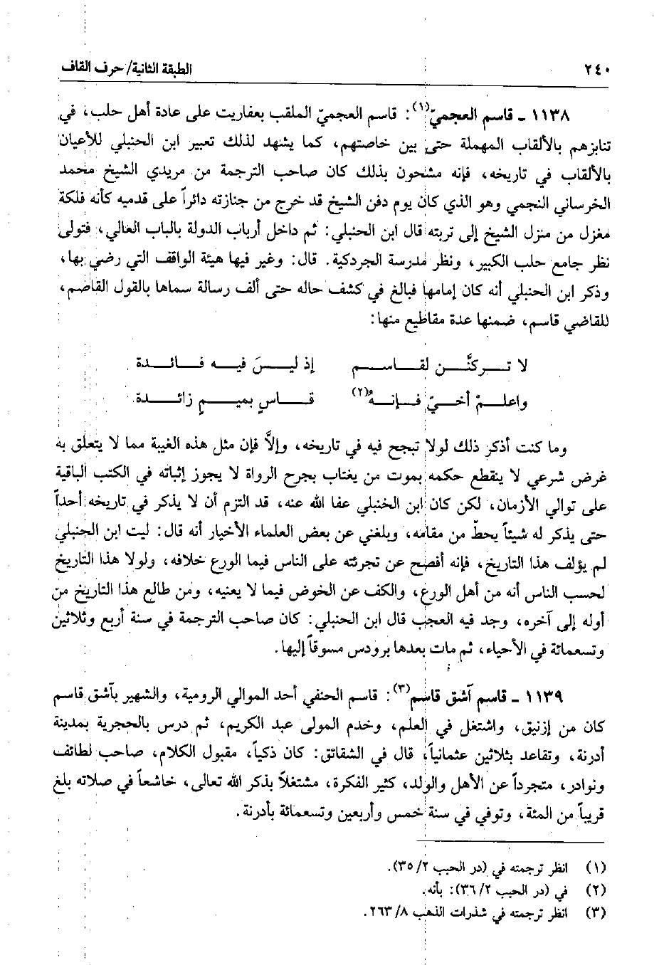 قاسم العجمي الملقب بعفاريت على عادة أهل حلب، في تنابزهم بالألقاب المهملة حتى بين خاصتهم، كما يشهد لذلك تعبير ابن الحنبلي للأعيان بالألقاب في تاريخه، فإنه مشحون بذلك كان صاحب الترجمة من مريدي الشيخ محمد الخرساني النجمي وهو الذي كان يوم دفن الشيخ قد خرج من جنازته دائراً على قدميه كأنه فلكة مغزل من منزل الشيخ إلى تربته قال ابن الحنبلي: ثم داخل أرباب الدولة بالباب العالي، فتولى نظر جامع حلب الكبير، ونظر مدرسة الجردكية. قال: وغير فيها هيئة الواقف التي رضي بها، وذكر ابن الحنبلي أنه كان إمامها فبالغ في كشف حاله حتى ألف رسالة سماها بالقول القاصم، للقاضي قاسم، ضمنها عدة مقاطيع منها: