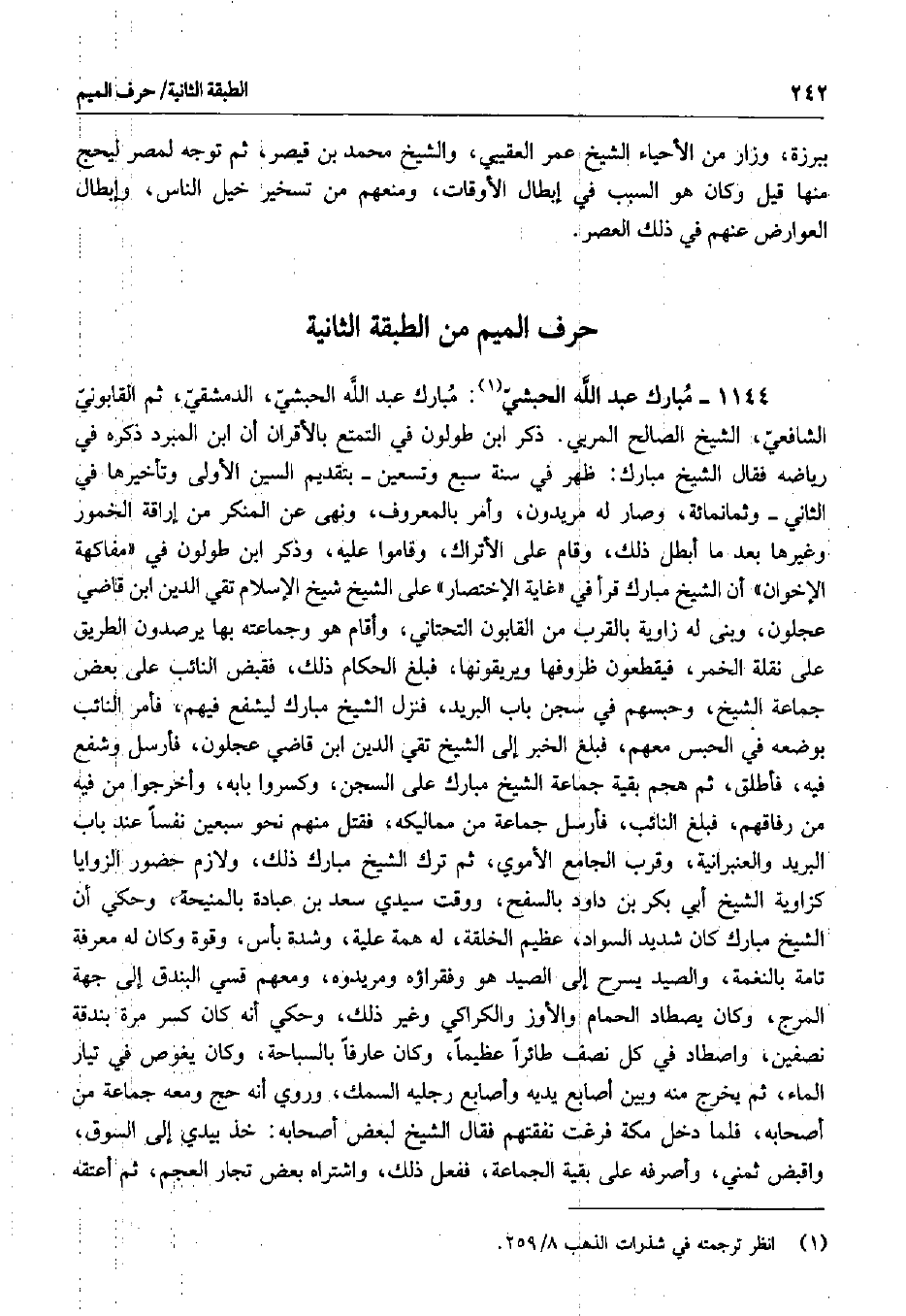 مبارك عبد الله الحبشي، الدمشقي، ثم القابوني الشافعي، الشيخ الصالح المربي. ذكر ابن طولون في التمتع بالأقران أن ابن المبرد ذكره في رياضه فقال الشيخ مبارك: ظهر في سنة سبع وتسعين - بتقديم السين الأولى وتأخيرها في الثاني - وثمانمائة، وصار له مريدون، وأمر بالمعروف، ونهى عن المنكر من إراقة الخمور وغيرها بعد ما أبطل ذلك، وقام على الأتراك، وقاموا عليه، وذكر ابن طولون في مفاكهة الإخوان أن الشيخ مبارك قرأ في غاية الإختصار على الشيخ شيخ الإسلام تقي الدين ابن قاضي عجلون، وبنى له زاوية بالقرب من القابون التحتاني، وأقام هو وجماعته بها يرصدون الطريق على نقلة الخمر، فيقطعون ظروفها ويريقونها، فبلغ الحكام ذلك، فقبض النائب على بعض جماعة الشيخ، وحبسهم في سجن باب البريد، فنزل الشيخ مبارك ليشفع فيهم، فأمر النائب بوضعه في الحبس معهم، فبلغ الخبر إلى الشيخ تقي الدين ابن قاضي عجلون، فأرسل وشفع فيه، فأطلق، ثم هجم بقية جماعة الشيخ مبارك على السجن، وكسروا بابه، وأخرجوا من فيه من رفاقهم، فبلغ النائب، فأرسل جماعة من مماليكه، فقتل منهم نحو سبعين نفساً عند باب البريد والعنبرانية، وقرب الجامع الأموي، ثم ترك الشيخ مبارك ذلك، ولازم حضور الزوايا كزاوية الشيخ أبي بكر بن داود بالسفح، ووقت سيدي سعد بن عبادة بالمنيحة، وحكي أن الشيخ مبارك كان شديد السواد، عظيم الخلقة، له همة علية، وشدة بأس، وقوة وكان له معرفة تامة بالنغمة، والصيد يسرح إلى الصيد هو وفقراؤه ومريدوه، ومعهم قسي البندق إلى جهة المرج، وكان يصطاد الحمام والأوز والكراكي وغير ذلك، وحكي أنه كان كسر مرة بندقة نصفين، واصطاد في كل نصف طائراً عظيماً، وكان عارفاً بالسباحة، وكان يغوص في تيار الماء، ثم يخرج منه وبين أصابعه يديه وأصابع رجليه السمك، وروي أنه حج ومعه جماعة من أصحابه، فلما دخل مكة فرغت نفقتهم فقال الشيخ لبعض أصحابه: خذ بيدي إلى السوق، واقبض ثمني، وأصرفه على بقية الجماعة، ففعل ذلك، واشتراه بعض تجار العجم، ثم أعتقه