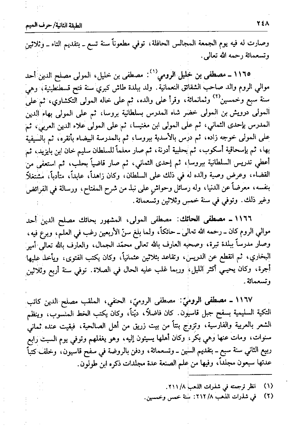 مصطفى الرومي، الحنفي، الملقب مصلح الدين كاتب التكية السليمية بسفح جبل قاسيون. كان فاضلاً، ديناً، وكان يكتب الخط المنسوب، وينظم الشعر بالعربية والفارسية، وتزوج بنتاً من بيت زريق من أهل الصالحية، فبقيت عنده ثماني سنوات، ومات عنها وهي بكر، وكان أهلها يسيئون إليه، وهو يغفلهم وتوفي يوم السبت رابع ربيع الثاني سنة سبع - بتقديم السين - وتسعمائة، ودفن بالروضة في سفح قاسيون، وخلف كتباً عدتها سبعون مجلداً، وفيها من علم الصنعة عدة مجلدات ذكره ابن طولون.