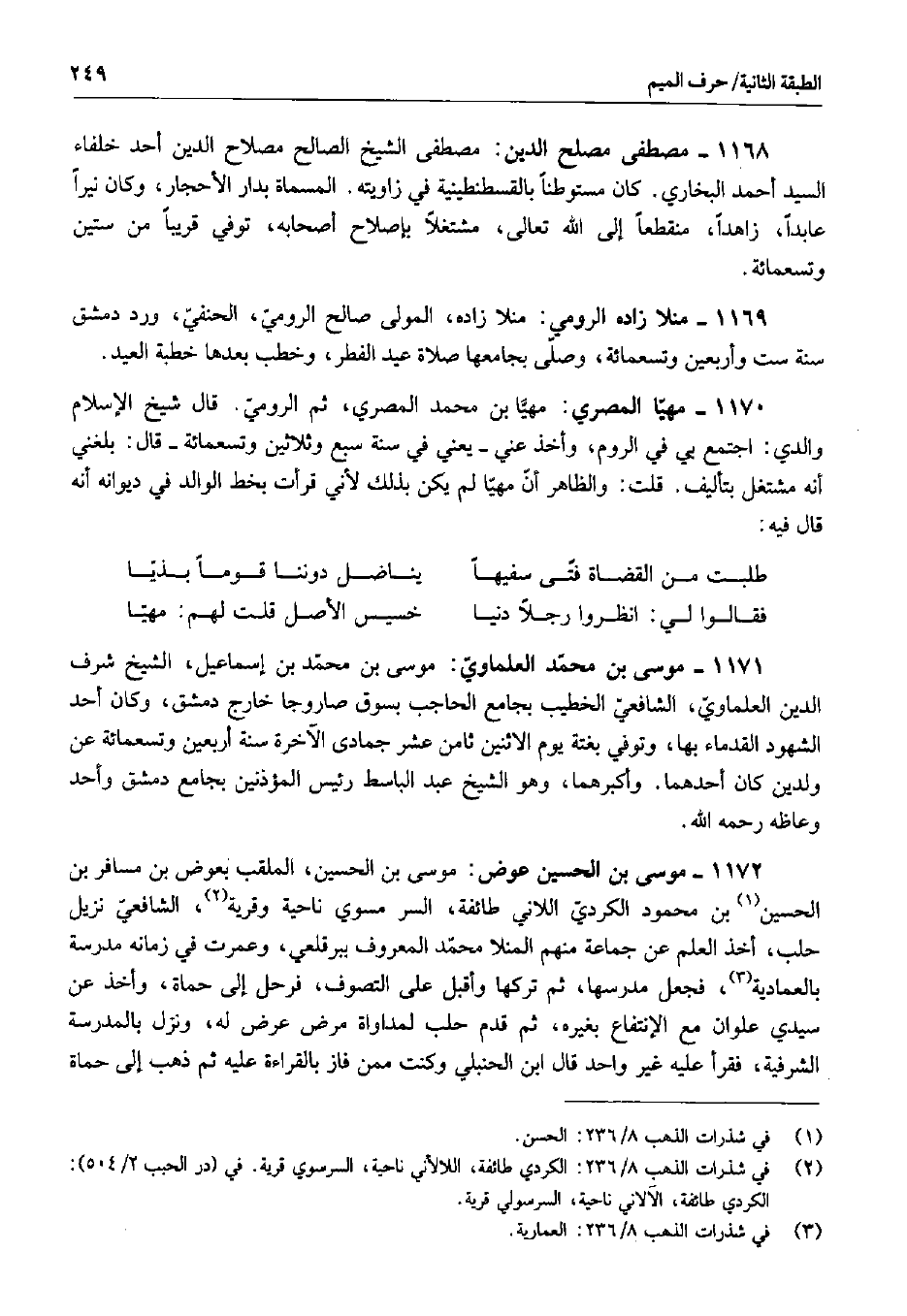 موسى بن الحسين، الملقب بعوض بن مسافر الحسين بن محمود الكردي اللاني طائفة، السر مسوي ناحية وقرية، الشافعي نزيل حلب، أخذ العلم عن جماعة منهم المنلا محمد المعروف ببرقلعي، وعمرت في زمانه مدرسة بالعمادية، فجعل مدرسها، ثم تركها وأقبل على التصوف، فرحل إلى حماة، وأخذ عن سيدي علوان مع الإنتفاع بغيره، ثم قدم حلب لمداواة مرض عرض له، ونزل بالمدرسة الشرفية، فقرأ عليه غير واحد قال ابن الحنبلي وكنت ممن فاز بالقراءة عليه ثم ذهب إلى حماه