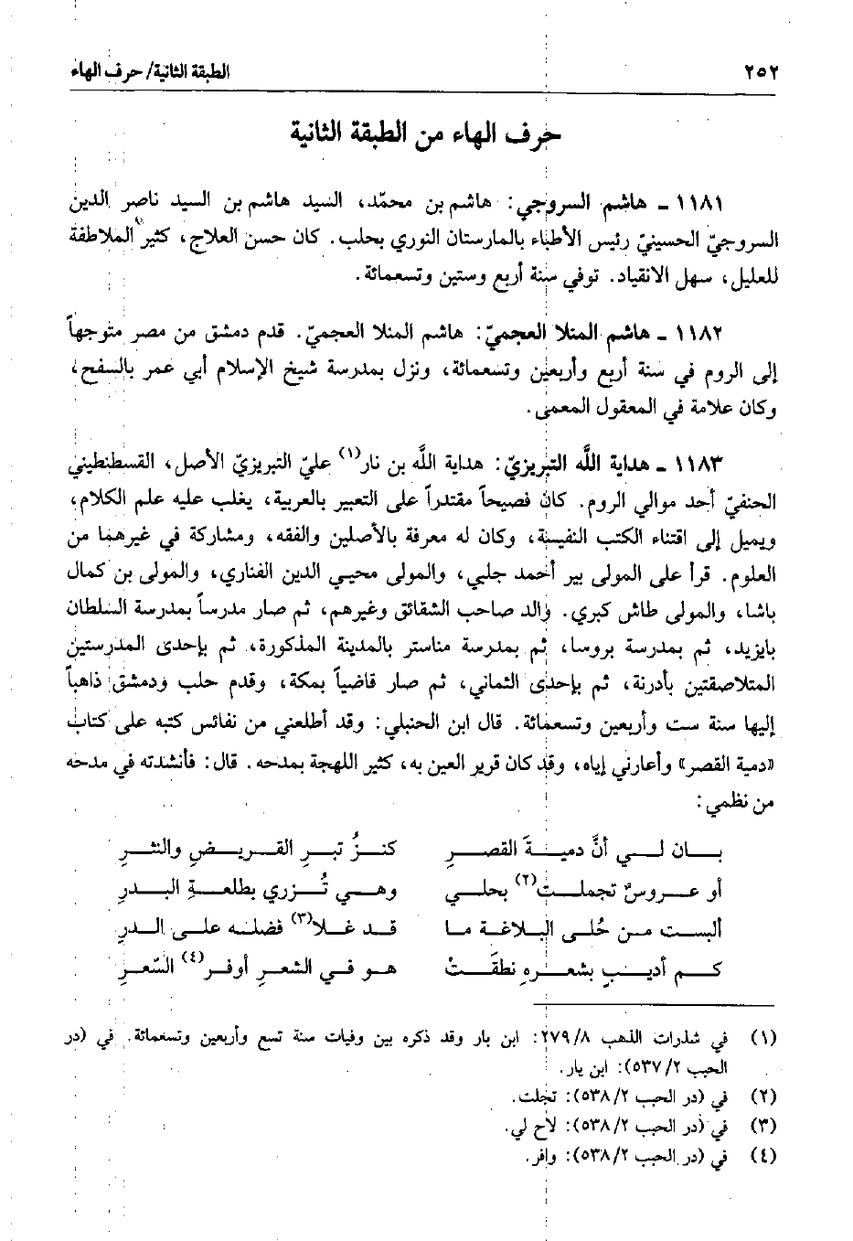 هداية الله بن نار علي التبريزي الأصل، القسطنطيني الحنفي أحد موالي الروم. كان فصيحاً مقتدراً على التعبير بالعربية، يغلب عليه علم الكلام، ويميل إلى اقتناء الكتب النفيسة، وكان له معرفة بالأصلين والفقه، ومشاركة في غيرهما من العلوم. قرأ على المولى بير أحمد جلبي، والمولى محيي الدين الفناري، والمولى بن كمال باشا، والمولى طاش كبري. والد صاحب الشقائق وغيرهم، ثم صار مدرساً بمدرسة السلطان بايزيد، ثم بمدرسة بروسا، ثم بمدرسة مناستر بالمدينة المذكورة، ثم بإحدى المدرستين المتلاصقتين بأدرنة، ثم بإحدى الثماني، ثم صار قاضياً بمكة، وقدم حلب ودمشق ذاهباً إليها سنة ست وأربعين وتسعمائة. قال ابن الحنبلي: وقد أطلعني من نفائس كتبه على كتاب دمية القصر وأعارني إياه، وقد كان قرير العين به، كثير اللهجة بمدحه. قال: فأنشدته في مدحه من نظمي: